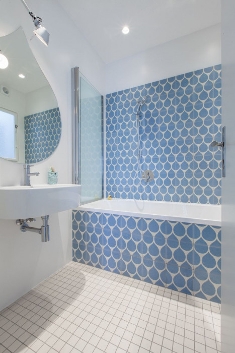 Dětský pokoj na opačné straně bytu má u sebe vlastní koupelnu s vanou a druhým wc. Každá z těchto tří hlavních částí má svůj vlastní výlez na terasu a – díky nově řešeným otvorům – možnost sem v letním období expandovat.