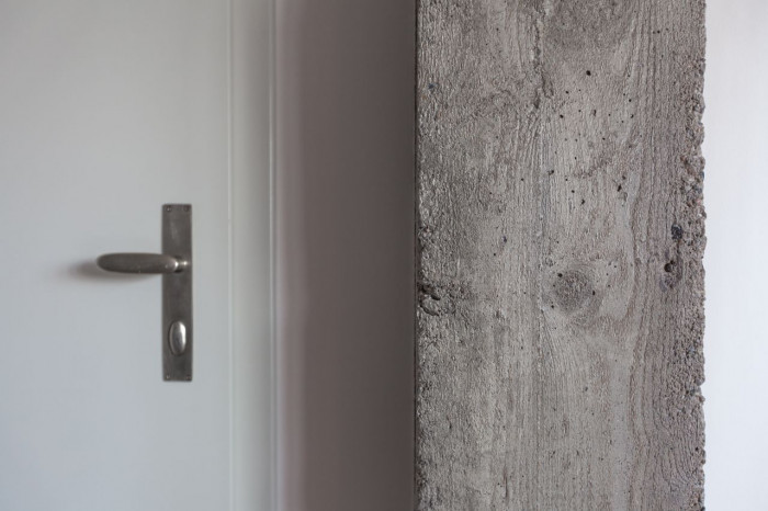 Atmosféru bytu pak dotváří odhalené betonové sloupy tvořící nosnou konstrukci domu a například originální staré kliky, obojí jako připomínka původního charakteru domu.
