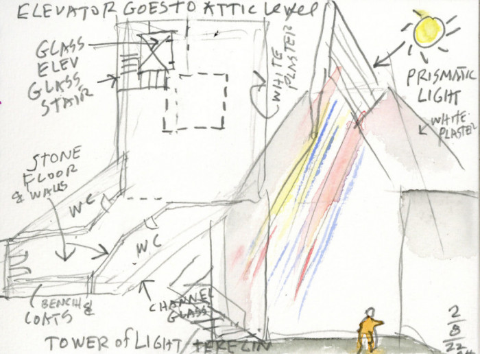 Transformace místa, obraz naděje a světla. Nevinný obraz Měsíční krajina terezínského mladého vězně Petra Ginze, symbolizující naději z bezvýchodné situace i nadhled, se stal inspirací pro náš návrh. Tower of Light je prostorem světla, jasným a expresivním vyjádřením tématu i provozních požadavků. Směřuje vzhůru, do nebe, za světlem, za nadějí. Nabízí ztišení, prostor pro vzpomínání i prostor pro vnímání a meditaci nad posvátností samotného života a sílou i křehkostí humanistických idejí. Tato důležitost naděje a světla je v ontologickém smyslu slova základem návrhu pro Muzeum Ghetta Terezín. Tower of Light jako maják naděje zářící mezi okolními domy do tmy. Naděje v lepší svět. Jde o místo imerze - vnímání emocí, ponoření se, vžití se do atmosféry či tématu muzea.