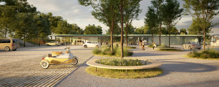 Parkoviště je svým pojetím navrženo jako nový park, který bude plnit nejen tranzitní funkci pro pěší provoz návštěvníků, ale poskytne také prostor pro odpočinek a čekání. Oválná objízdná trasa a uspořádání parkovacích stání na obou stranách dávají vzniknout velkoryse pojaté centrální ploše určené pro pobyt a vegetaci. Plocha bude osázena skupinami listnatých stromů domácího původu s podsadbou trvalek a okrasných trav a doplněna o nový mobiliář. Část vzdálená od hlavní komunikace je věnována parkování autobusů, plochy poblíž infocentra jsou určené pro parkování invalidů a další plochy jsou vymezené pro osobní automobily i s možností dobíjení elektromobilů. Šest podélných stání pro autobusy je vyhrazeno pro bezpečný výstup cestujících přímo na centrální pěší zónu.