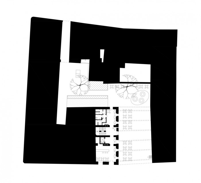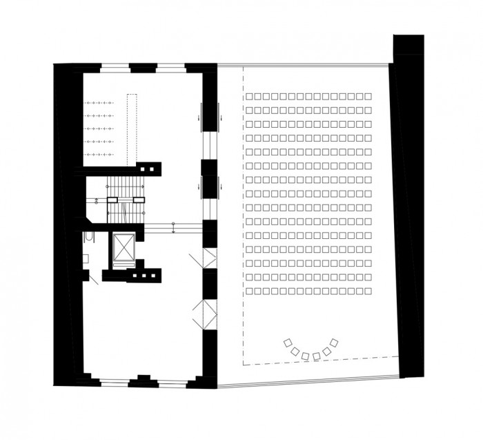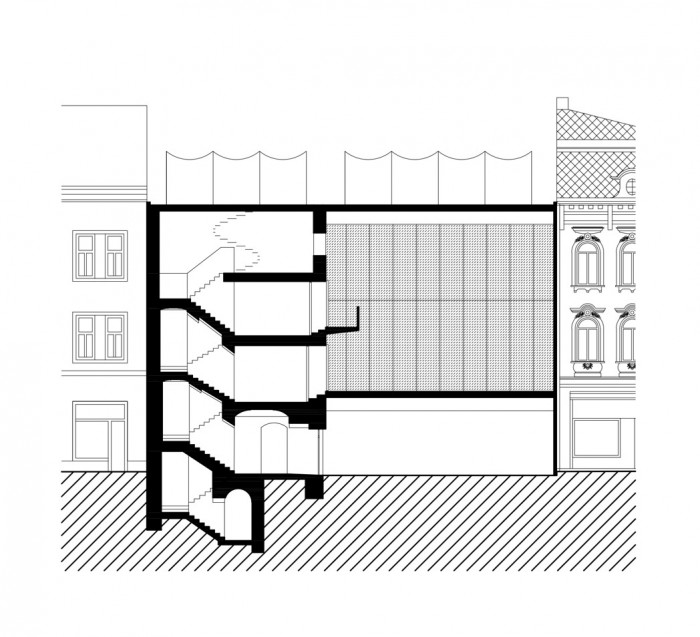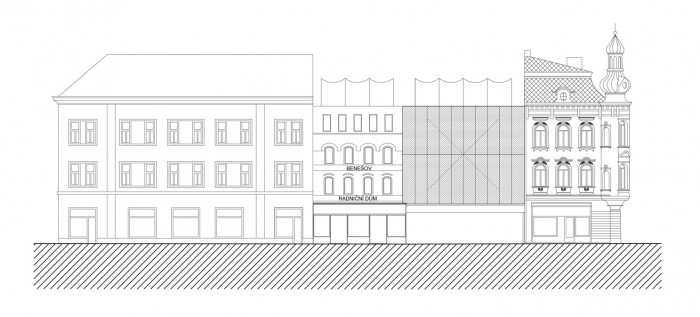 Dvojice radničních domů vrací na náměstí ztracenou noblesu ve formě současné multifunkční městské haly v proluce, propojené se sousední budovou turistického centra. Dvojice domů navazuje na řešení současné radnice, stávající dům poskytuje hale všechny obslužné funkce a nutné zázemí (foyer s kavárnou, komunikace, toalety, šatna a vstupy do sálu, na galerii a na balkon do náměstí). Předpokládáme jeho rekonstrukci interiérů či celkovou renovaci včetně fasád a možností nástavby inspirované dobovými fotografiemi). Nová „levitující“ městká hala je prázdný prostor ideálních rozměrů (shoe-box), vhodný pro koncerty (možnost vytvoření elevace), pro bály, konference, přehlídky, výstavy či burzy. Pod halou je vytvořen volný / průchozí a krytý prostor pro kavárnu či prostor pro kryté městské akce (podium a hlediště). Umístění haly do prvního patra umožnilo vytvořit velkorysý prostor pod ní a zároveň průchod a propojení dvora s plochou náměstí (v zimě uzavření mobilní prosklenou stěnou). Fasáda je navržena jako prosklená, stíněná kovovými perforovanými otevíratelnými panely s možností výhledu do náměstí z haly nebo z balkónu. Městská hala se tak stává součástí náměstí a náměstí součástí haly. Na fasádě je lehce naznačený ornament osmicípé hvězdy (jiná perforace). Konstrukce je ocelovo betonová. Střecha je pochozí, se zastíněnou terasou s výhledem do náměstí.