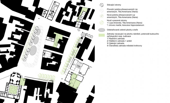 Stromy jsou navrženy téměř podél všech ploch náměstí, rovnoběžně s méně významnými domy, na jedné straně, aby byla zachována celistvost a průhledy na prostor. Doplněním části lip amerických vznikla velkorysá alej s pevným posezením. Dvůr nabízí klidné a intimní posezení pod stromy (jírovec maďal), s travnatými a trvalkovými záhony, vodními zdroji a herními prvky. Další zeleň nabízí plocha vedle kostela a za knihovnou (předpokládaná renovace dobových ploch). Klidové zóny či posezení nabízí prostor pod novou městskou halou či loubí polikliniky, možnost posezení mladší generace umožňují žulové schody, které vyrovnávají výškové rozdíly na horní ploše náměstí.