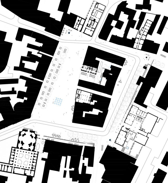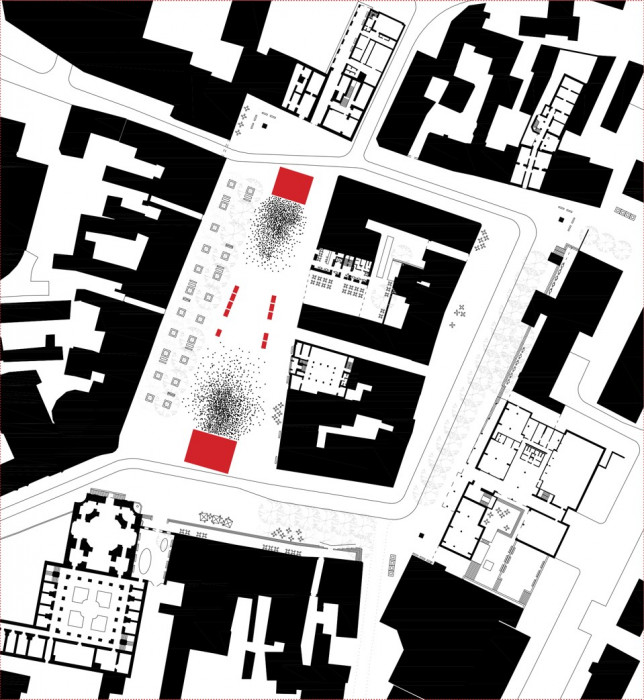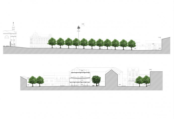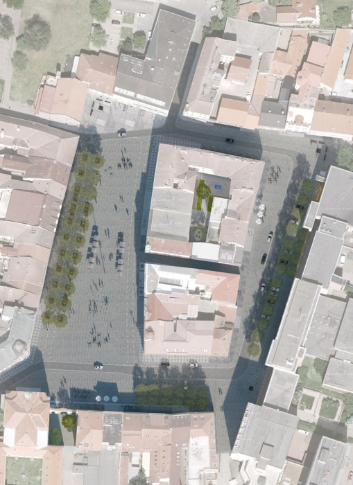 Dvojice náměstí tvoří jednotnou plochu sjednocenou povrchy a otevřenou k významným domům. Sdílený prostor poskytuje velkorysou a přehlednou plochu pro různorodé využití, pro veřejný a živý každodenní život (kulturní i sociální), pro všechny generace. Masarykovo náměstí je nově důstojným reprezentačním i rekreačním prostorem dostatečné velikosti, přehledným od radnice až ke kostelu. Řady stromů definují tvar prostoru a nabízejí stín pro odpočinek s výhledem na budovy. Malé náměstí, lemované jednou řadou stromů, se znovu stává náměstím s průhledem na secesní muzeum. Okraje jsou vymezeny pro komunikaci, zásobování a parkování. Náměstí oživuje i nová dvojice radničních domů, městská hala v proluce a stávající sousední dům. Plocha umožňuje umístění dvou podií i možnost využívat krytý prostor pod stavbou v proluce (např. venkovní kryté jevište i hlediště) či nového městského společenského sálu (městská hala) ve zvýšeném patře. Předpokládáme realizaci rekonstrukce po etapách.