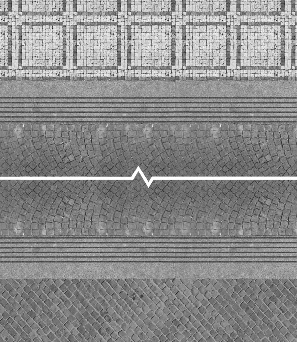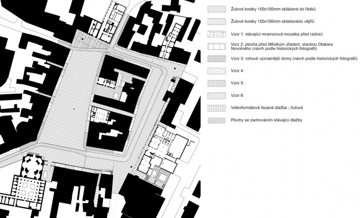 Jednotný povrch pro většinu ploch tvoří maloformátová žulová dlažba 10x10cm (historicky žulová vyvýšenina), náměstí je z kostek v řádkách, komunikace do vějíře, oddělení tvoří žulové pásy. Před domy jsou (dle historických fotografií) mozaikové „vzorované koberce“ s ornamenty (7 vzorů podle významu budov), podobně v současnosti řešeno před radnicí. Parkovací místa z žulových kostek jsou kladeny do řádků (předpoklad postupného úbytku parkování). Parkování předpokládáme řešit vybudováním parkovacího domu v kombinaci se stáním v přilehlých ulicích (viz schéma). Povrchy jsou sjednocené do jedné roviny a plocha je bez výškových přechodů vyjma žulových schodů. Na náměstí je možné umístit průhled do podzemí. Materiály jsou standartní a civilní, trvanlivé, bezčasé, ale i dostatečně reprezentativní. Nejsou historizující.