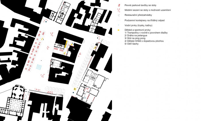 Osvětlení (fasádní i stojací) i mobiliář (pevné atypické lavičky kolem stromů se stoly, podél vybraných budov, sezónní mobilní lavičky, stojany na kola, koše) odpovídá celkovému řešení a je v souladu s manuálem města. Předzahrádky jsou navrženy jako nekryté a mobilní s kultivací parteru i stínění.