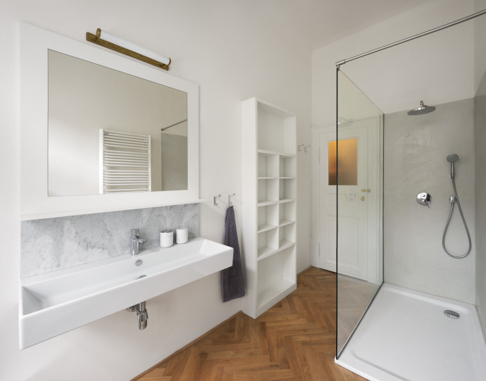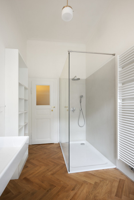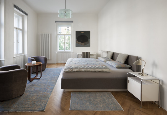 Dispozice bytu byla upravena při zachování klasického řazení průchozích pokojů. Podlahy byly nahrazeny novými dubovými vlysy. Všechny původní stavební prvky jako okna, dveře či kování byly zachovány a opraveny. Charakteru klasického bytu odpovídá i výběr nábytku a svítidel z přelomu devatenáctého a dvacátého století. Jedná se většinou o repliky od firmy Modernista. Vestavný nábytek a kuchyň byly vyrobené na míru z lakované MDF. Interiér doplňují ručně vázané koberce.