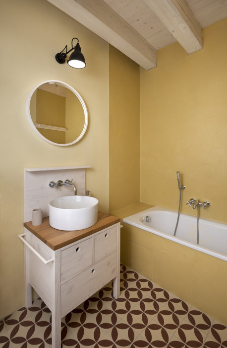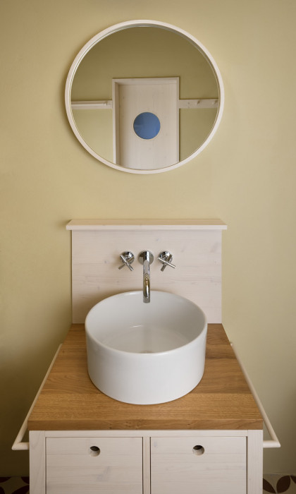 Na zadláždění chodby jsme navrhly využít staré půdovky. Pro kuchyň, komoru a koupelny byla zakázkově vyrobena dlažba s historickým vzorem. Ostatní podlahy jsou dubové.