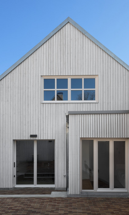 Dvorek se solitérním stromem a zelení v květináčích je vydlážděn odřezky z cihel. Je to další obývací pokoj domu pod širým nebem. Do jeho zadní části je vestavěna nová kůlna s dílnou. Stěna kůlny je sjednocena se severním průčelím domu fasádou z modřínových latí. Všechny nové dřevěné prvky – stropy, příčky, vnitřní dveře – jsou z běleného smrku.