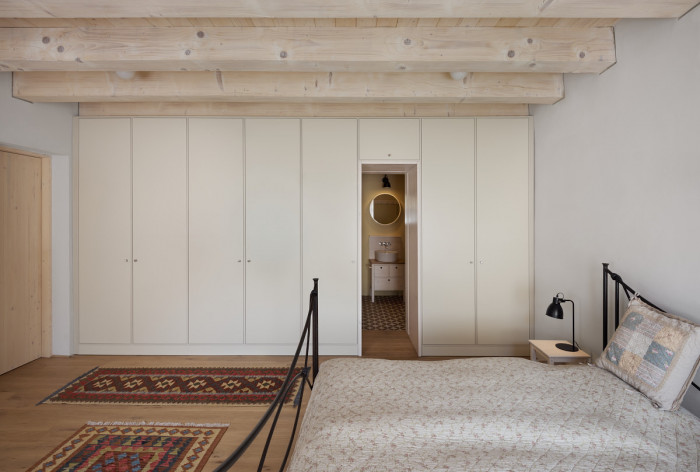 Část nábytku byla provedena na míru a kombinuje bělený smrk, dubové prkno a lakovanou MDF. Interiér si majitelka doplnila vlastním mobilním nábytkem a lampami.