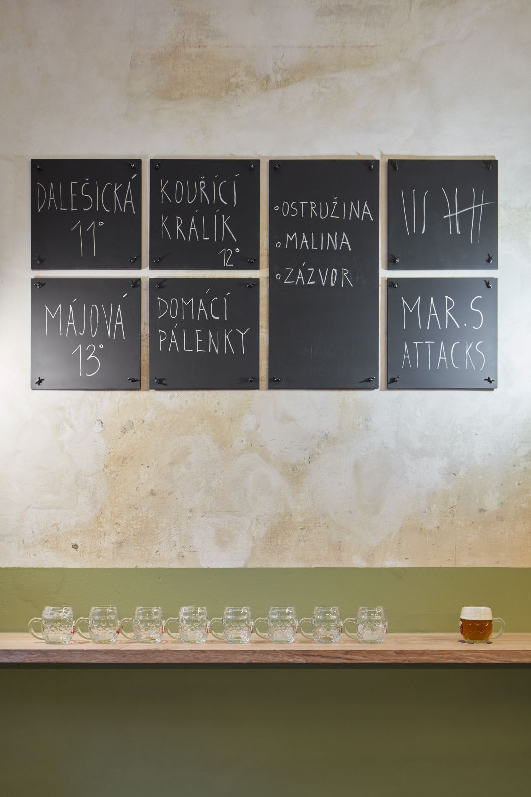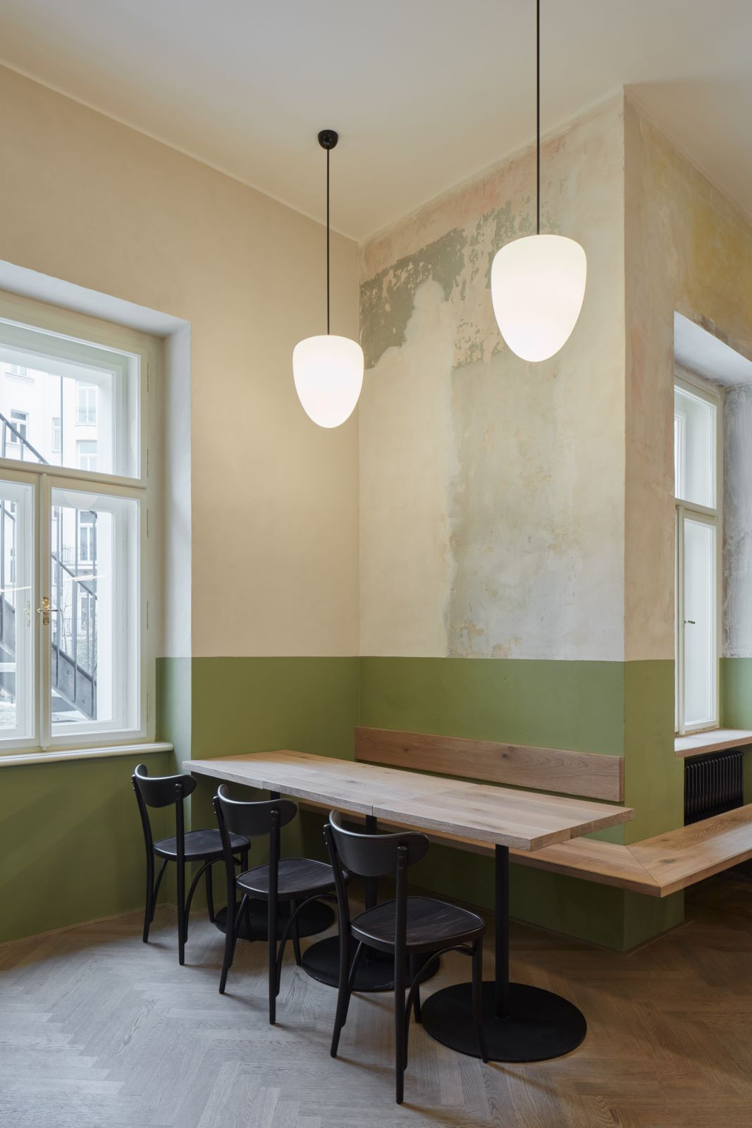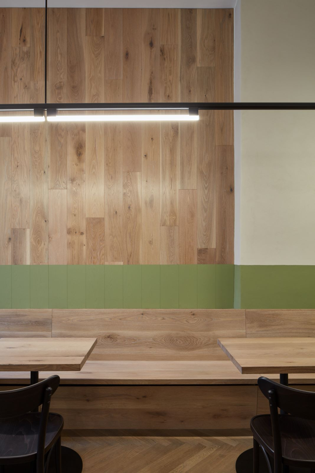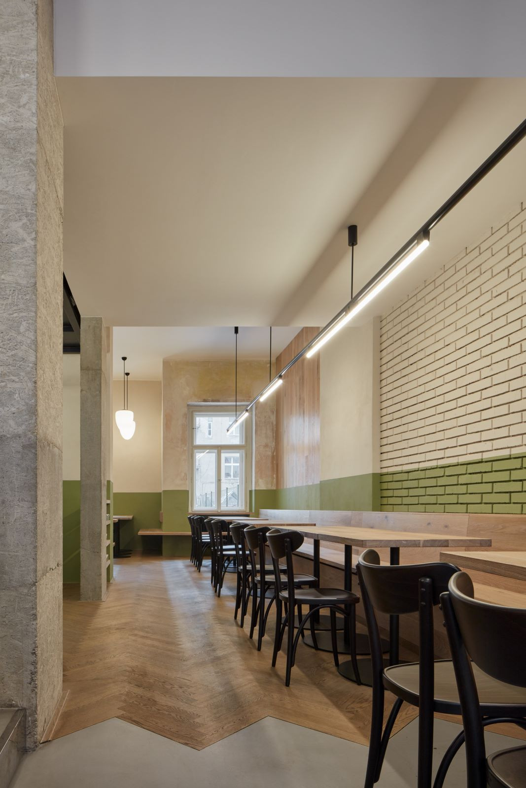 Častým prvkem interiérů bylo dřevěné obložení stěn, které je chránilo před poškozením a parketová podlaha. Jako odkaz na obložení stěn je v interiéru použit zelený pás z omyvatelné barvy, který se vine celým prostorem a propojuje jinak materiálově zcela odlišné stěny do jednoho celku. Na podlaze jsou použity dubové vlýsky poskládané do tradičního stromečku. Nábytek je kombinací atypických dřevěných lavic a stolů a typicky hospodských židlí TON banana v tmavě hnědé barvě.
