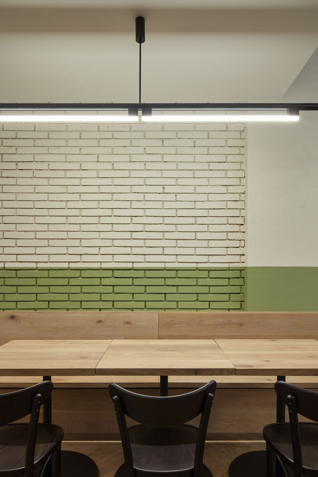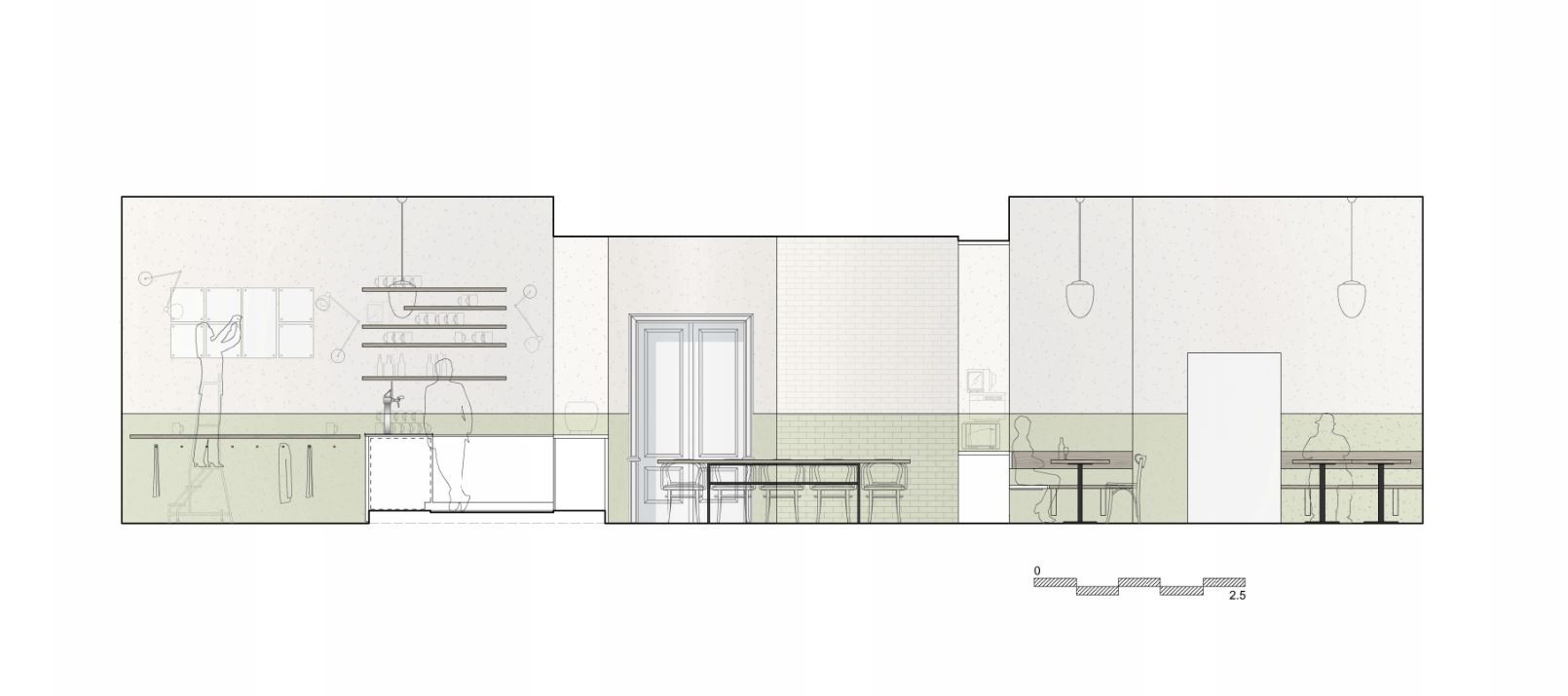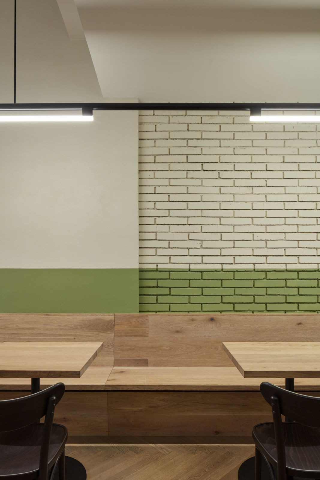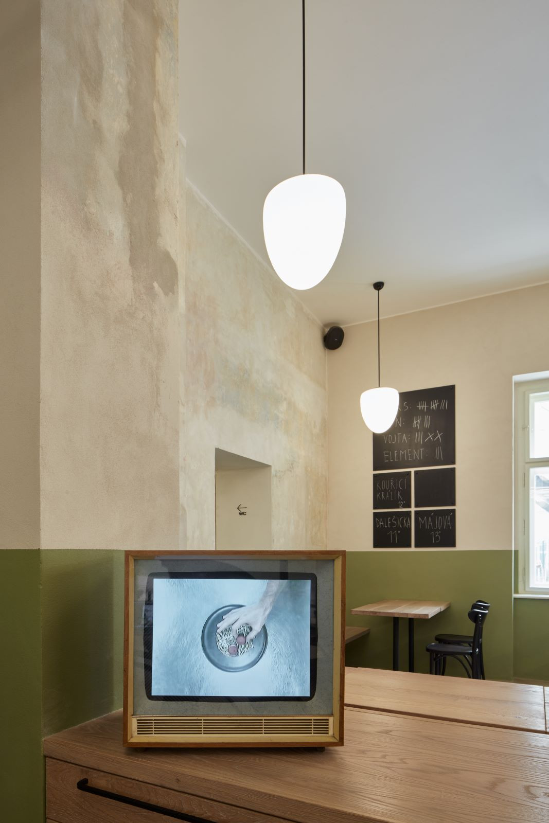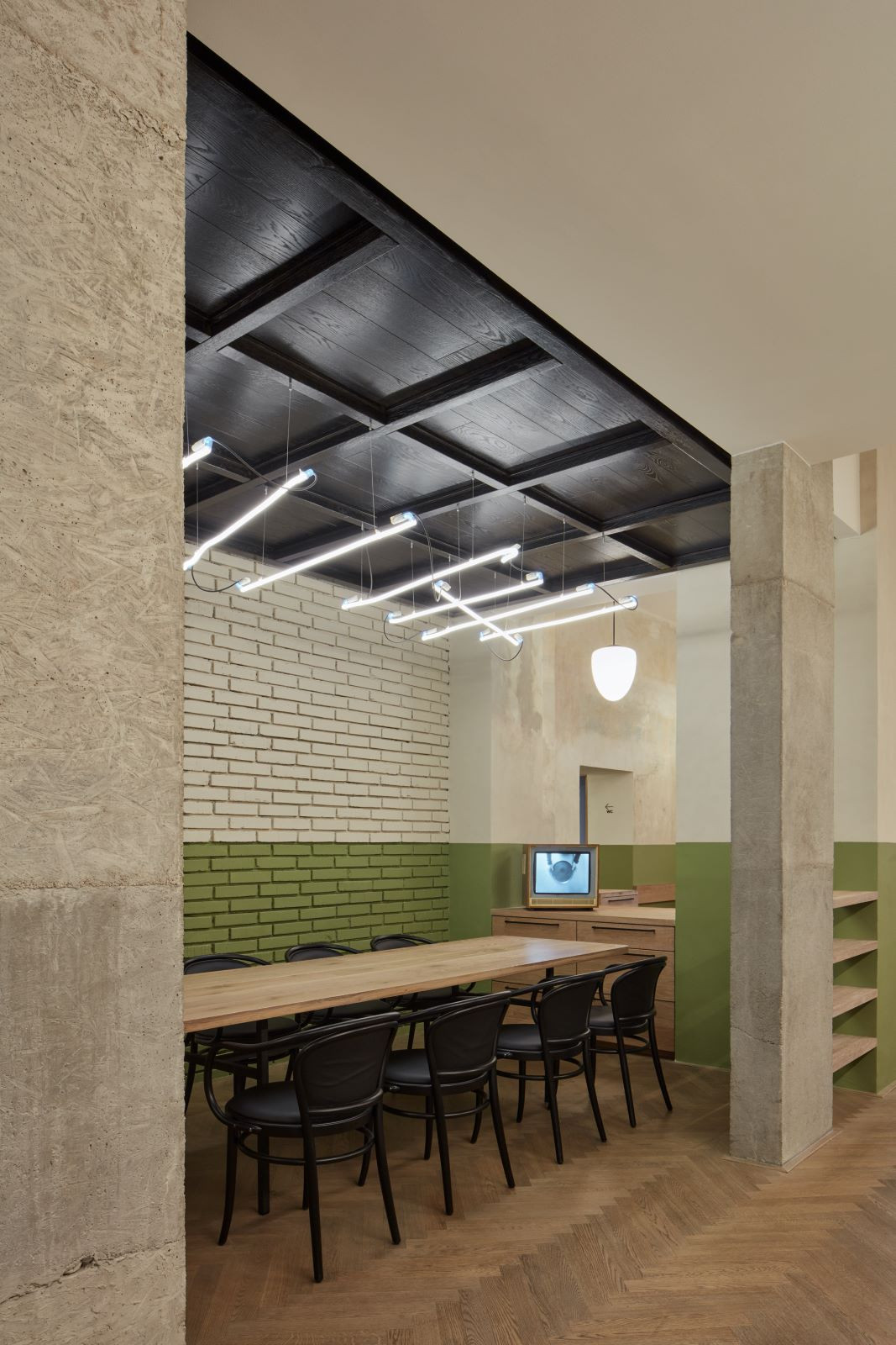 Častým prvkem interiérů bylo dřevěné obložení stěn, které je chránilo před poškozením a parketová podlaha. Jako odkaz na obložení stěn je v interiéru použit zelený pás z omyvatelné barvy, který se vine celým prostorem a propojuje jinak materiálově zcela odlišné stěny do jednoho celku. Na podlaze jsou použity dubové vlýsky poskládané do tradičního stromečku. Nábytek je kombinací atypických dřevěných lavic a stolů a typicky hospodských židlí TON banana v tmavě hnědé barvě.
