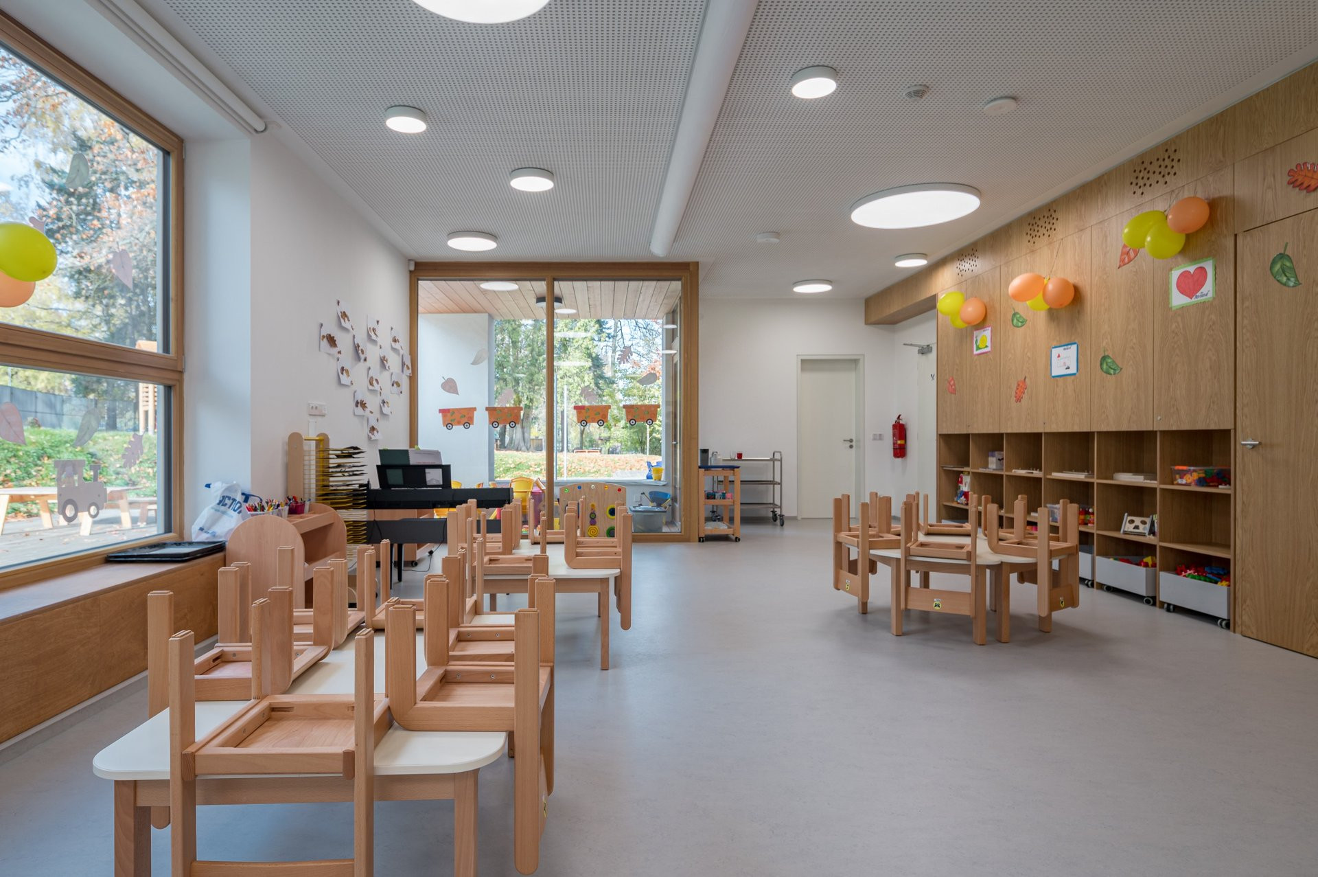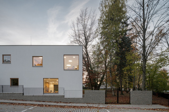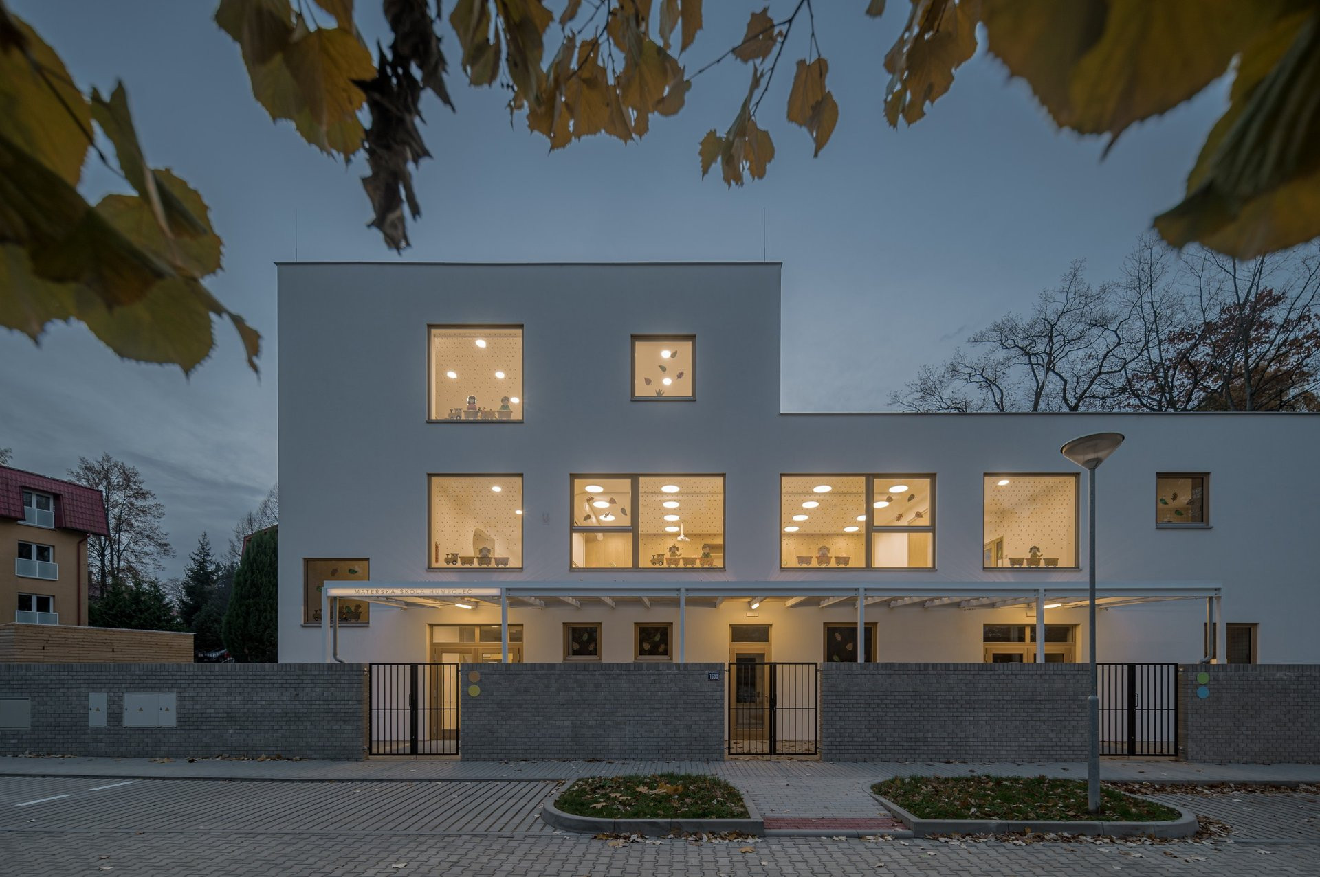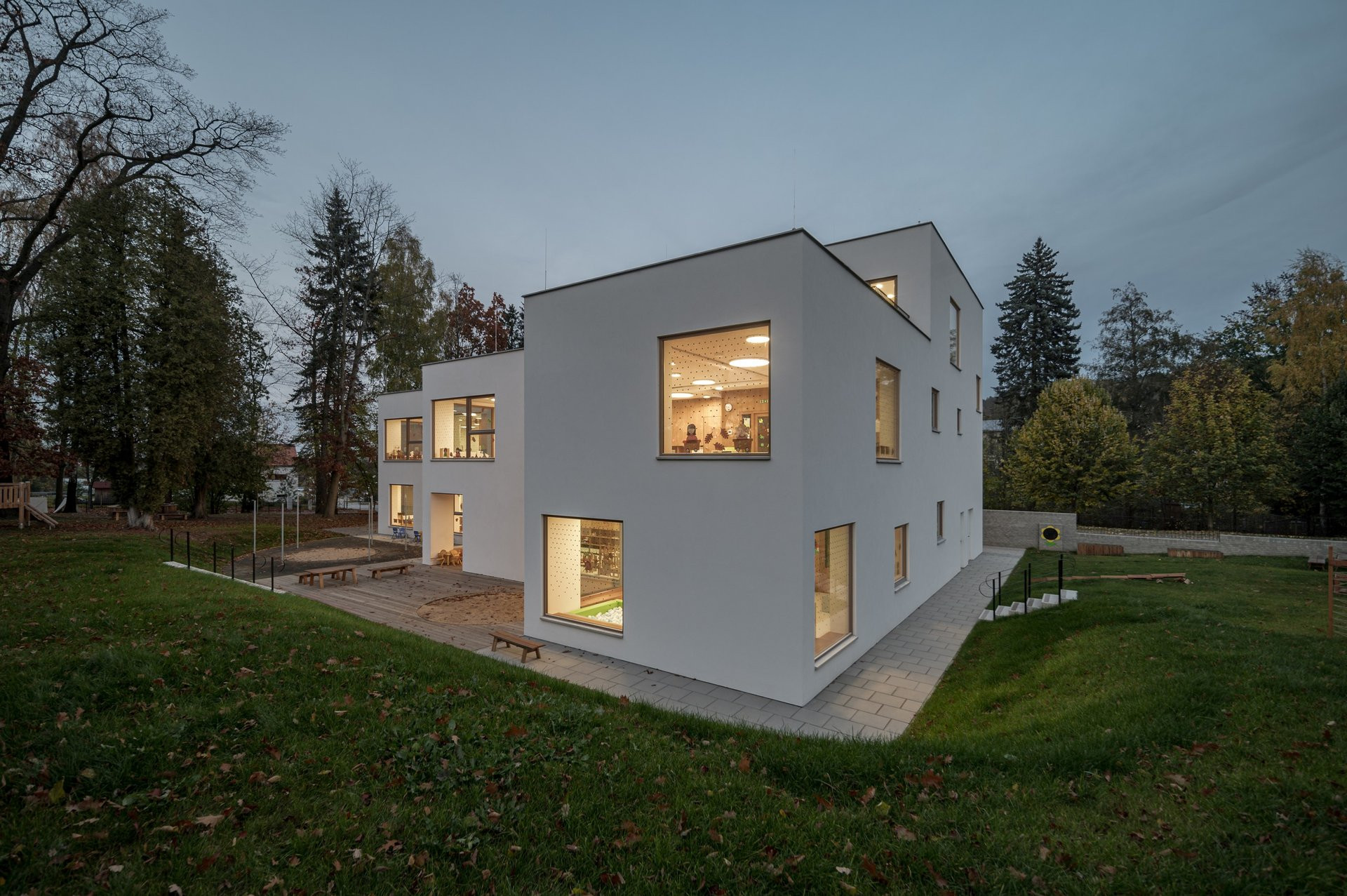 Záměrem bylo navrhnout dům, který racionálním a zároveň atraktivním způsobem využije kvalitu místa a bude zábavný i podnětný pro děti i pedagogy. Pevná forma, kterou se bílá stavba s plochými střechami prezentuje do ulice, se směrem do zahrady rozpadá v několika zalomeních. Každá třída se velkými okny otevírá do tří světových stran. Stavba je částečně zapuštěna do svažitého terénu, travnaté svahy se stávají dalším herním prvkem.