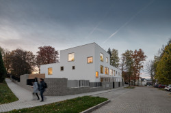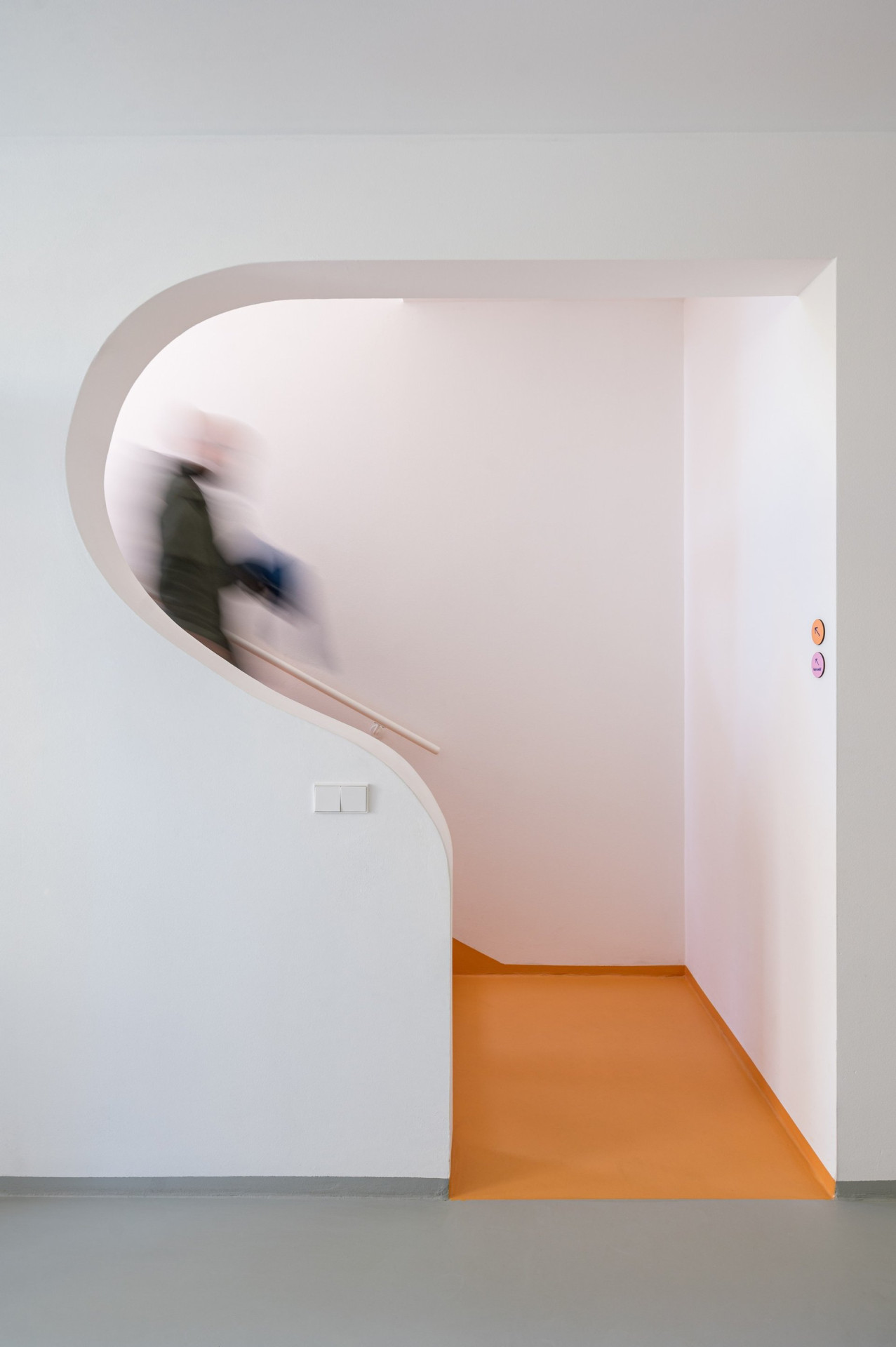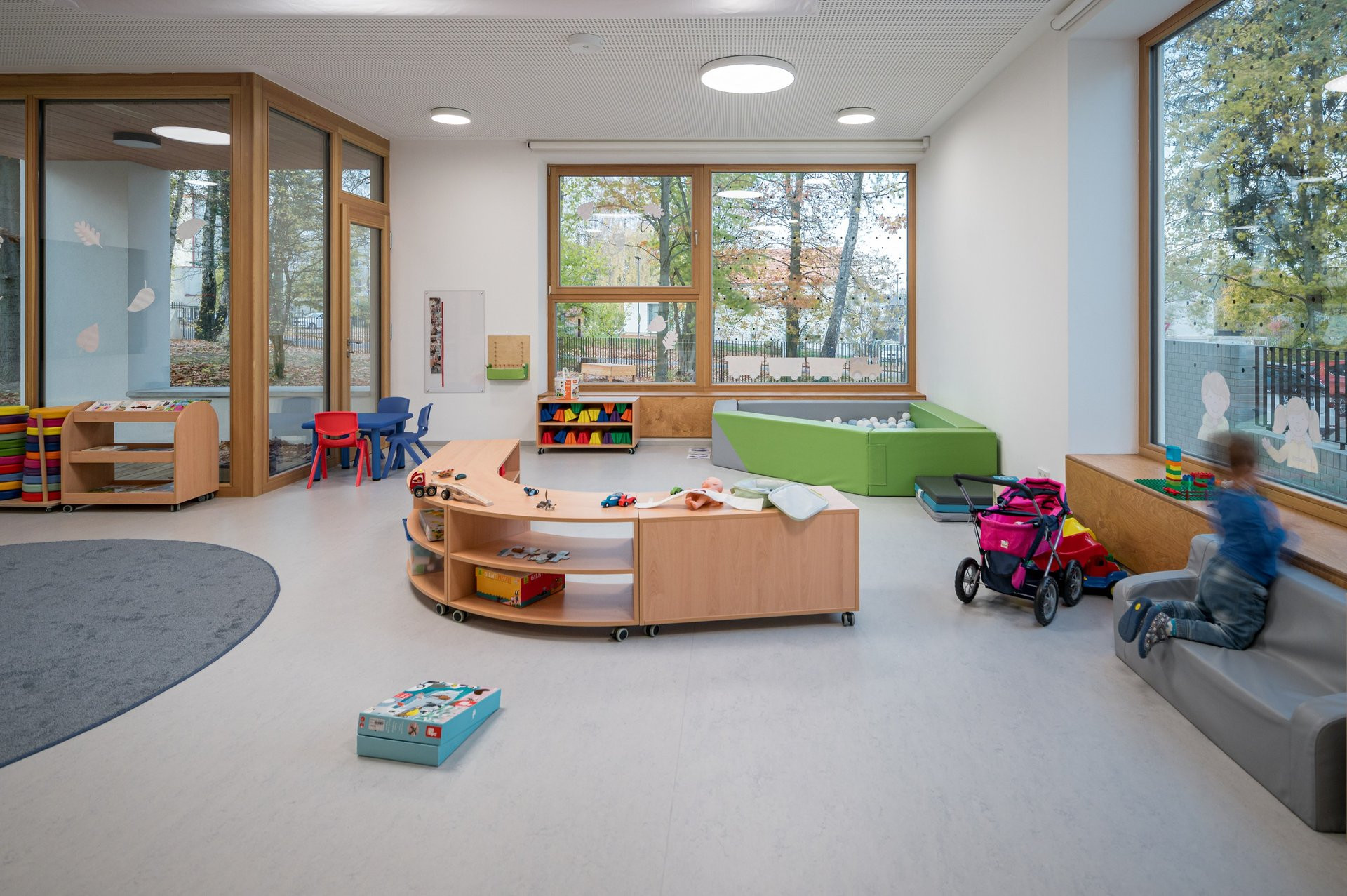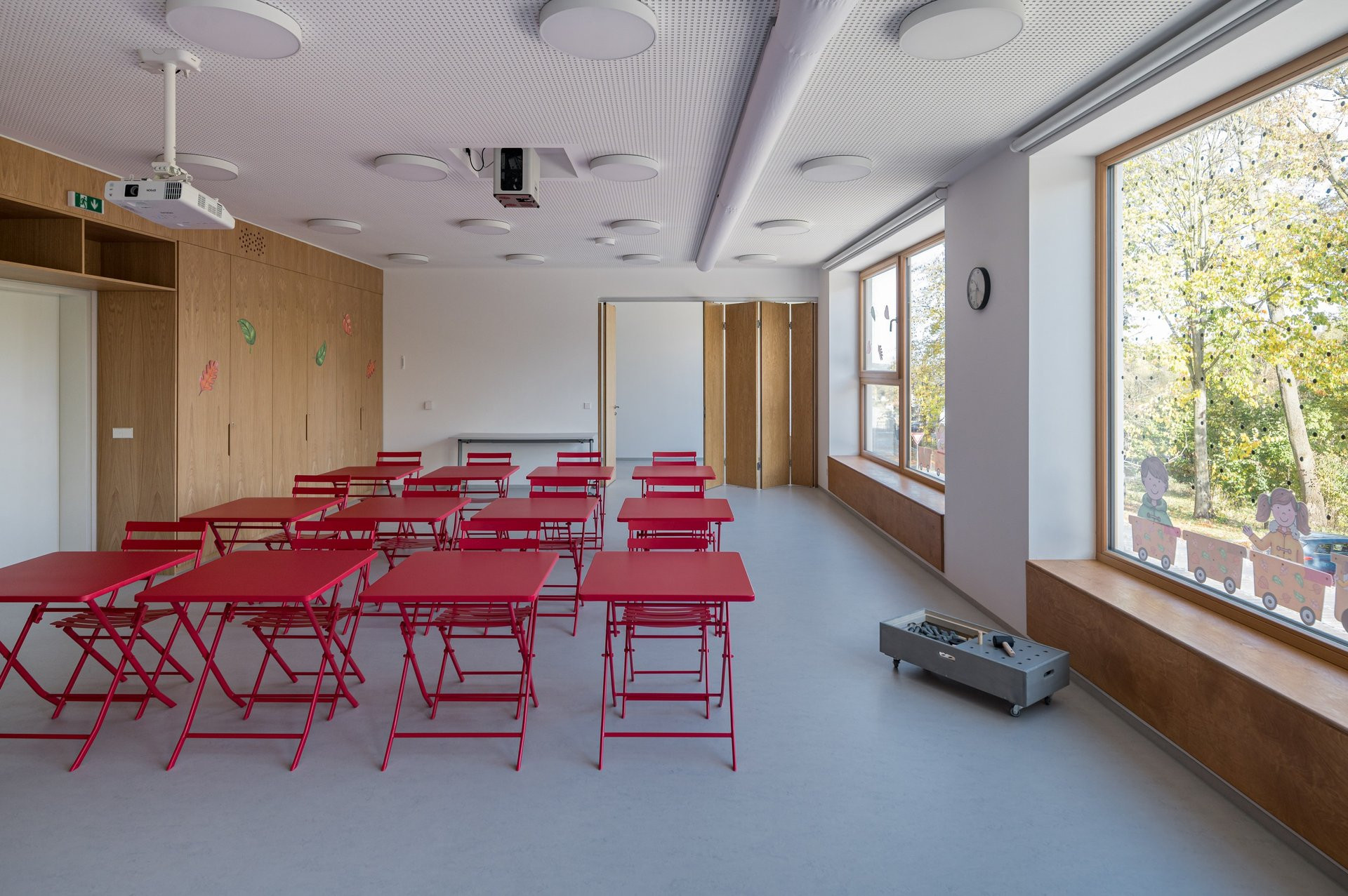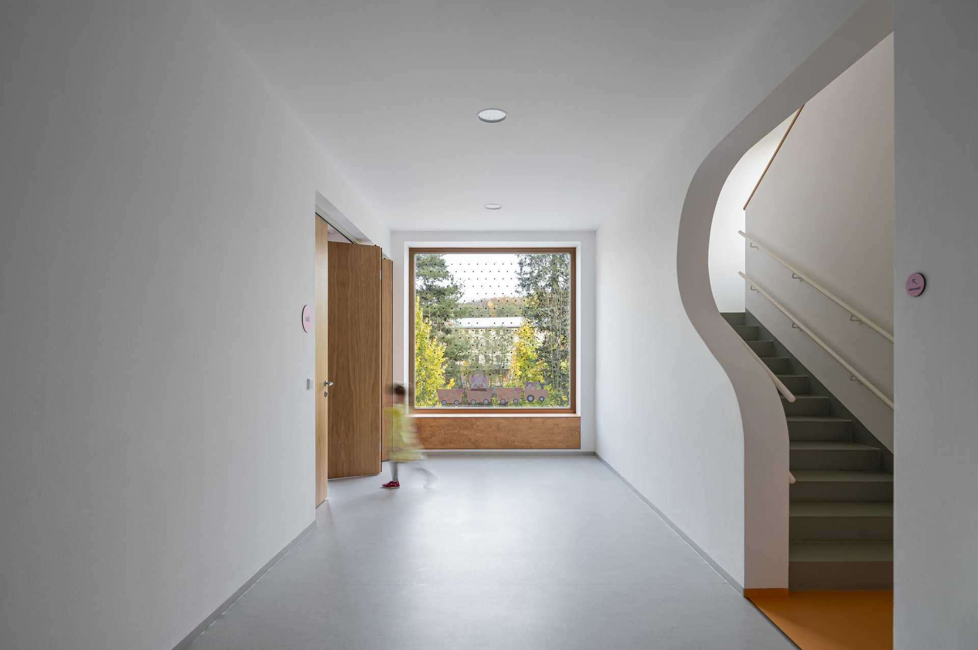 Záměrem bylo navrhnout dům, který racionálním a zároveň atraktivním způsobem využije kvalitu místa a bude zábavný i podnětný pro děti i pedagogy. Pevná forma, kterou se bílá stavba s plochými střechami prezentuje do ulice, se směrem do zahrady rozpadá v několika zalomeních. Každá třída se velkými okny otevírá do tří světových stran. Stavba je částečně zapuštěna do svažitého terénu, travnaté svahy se stávají dalším herním prvkem.