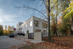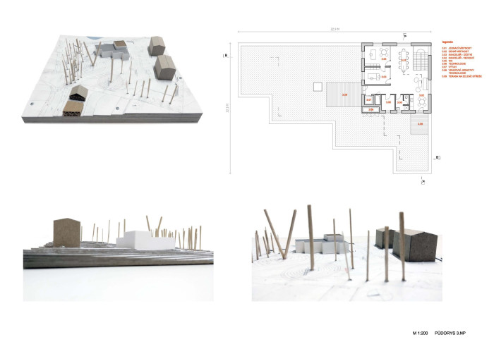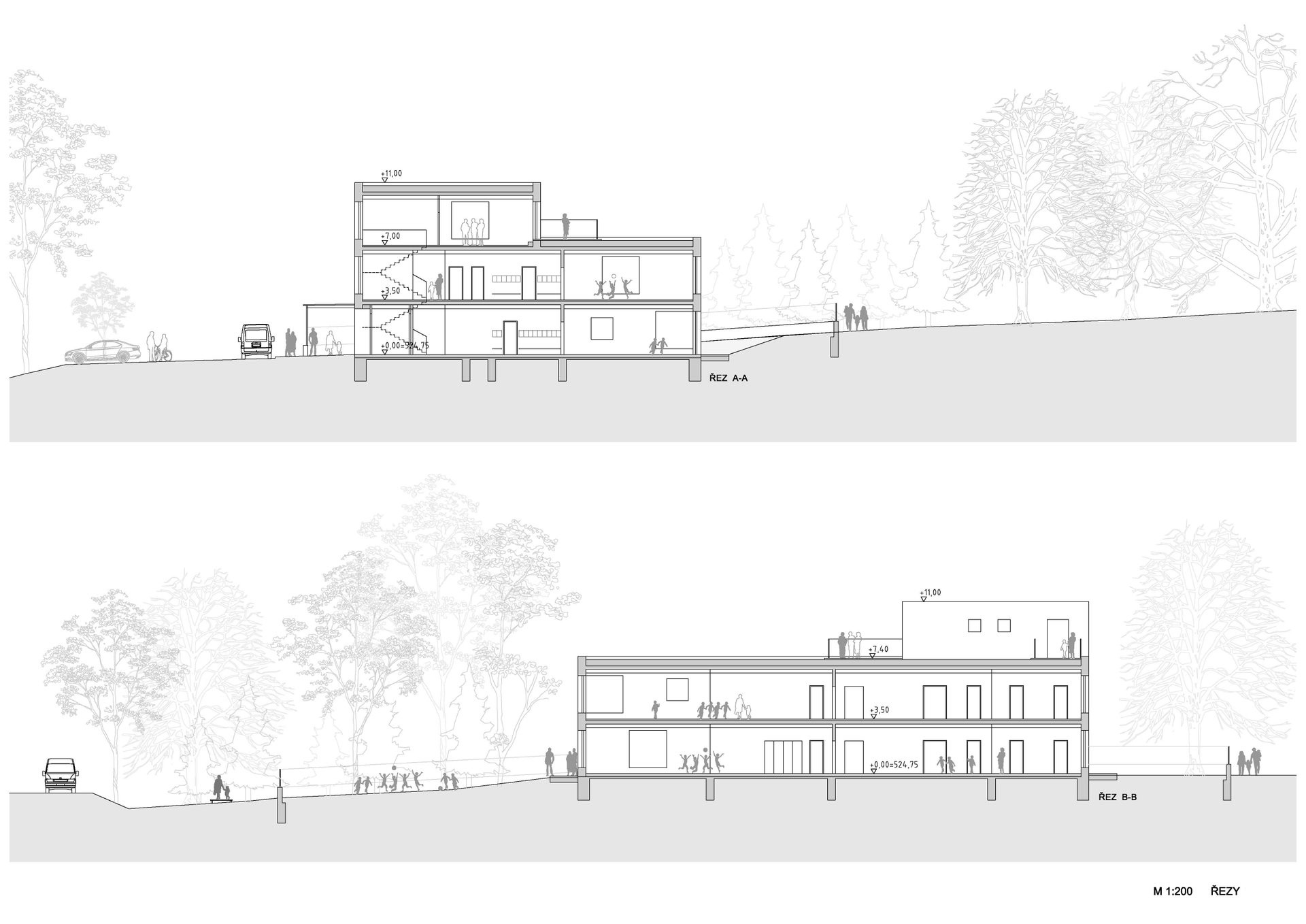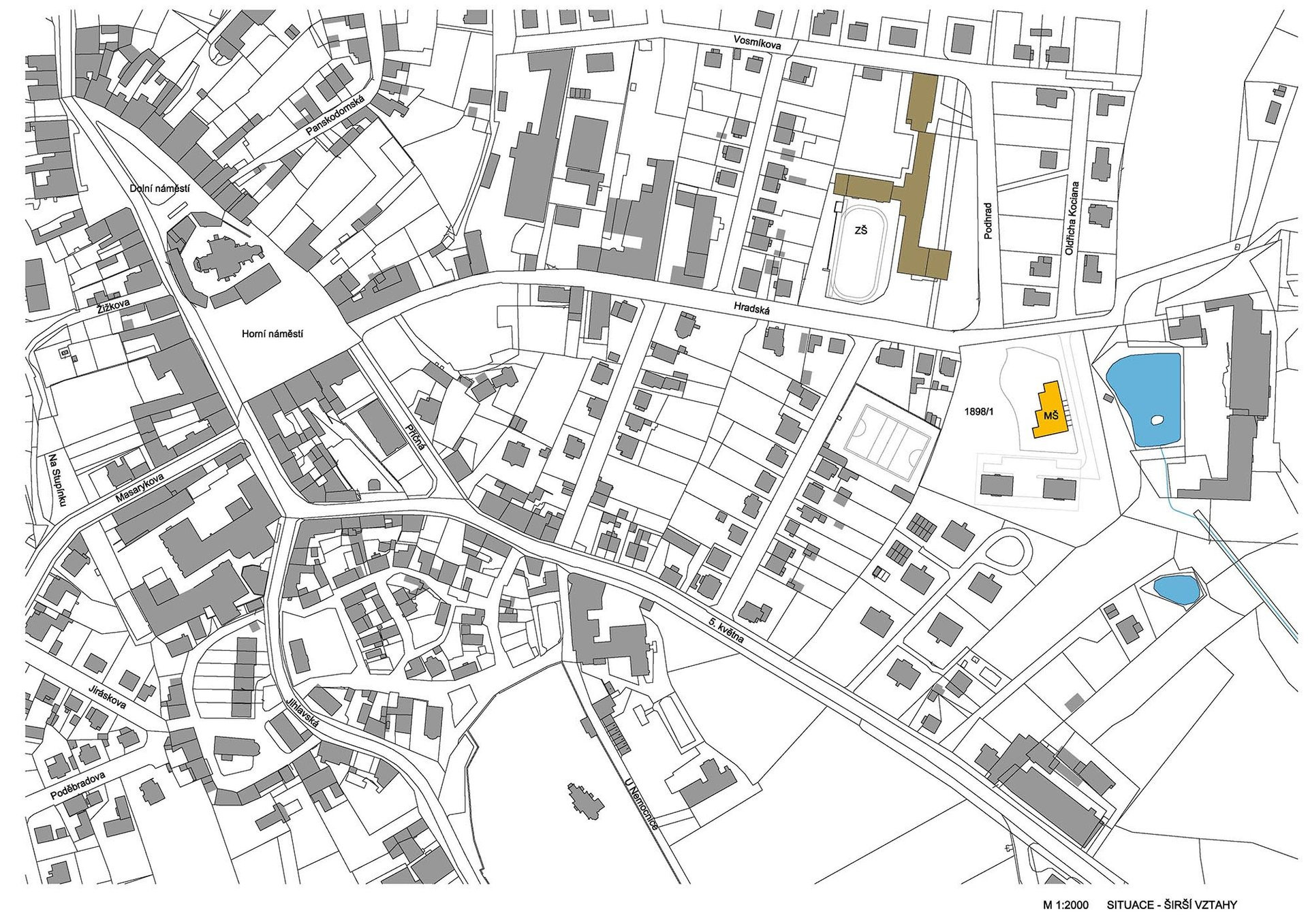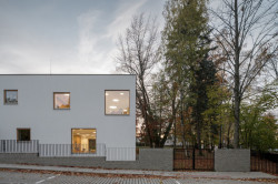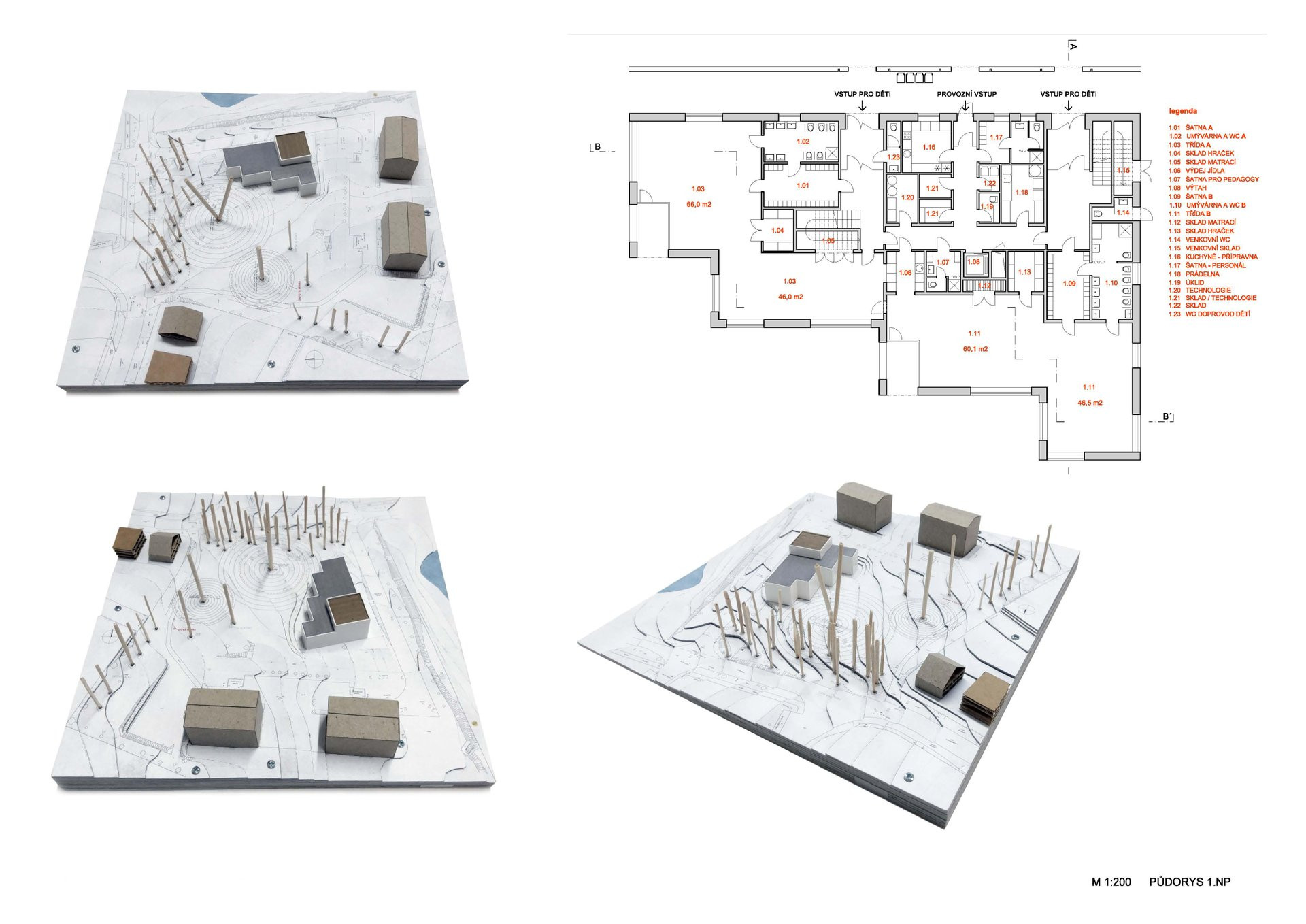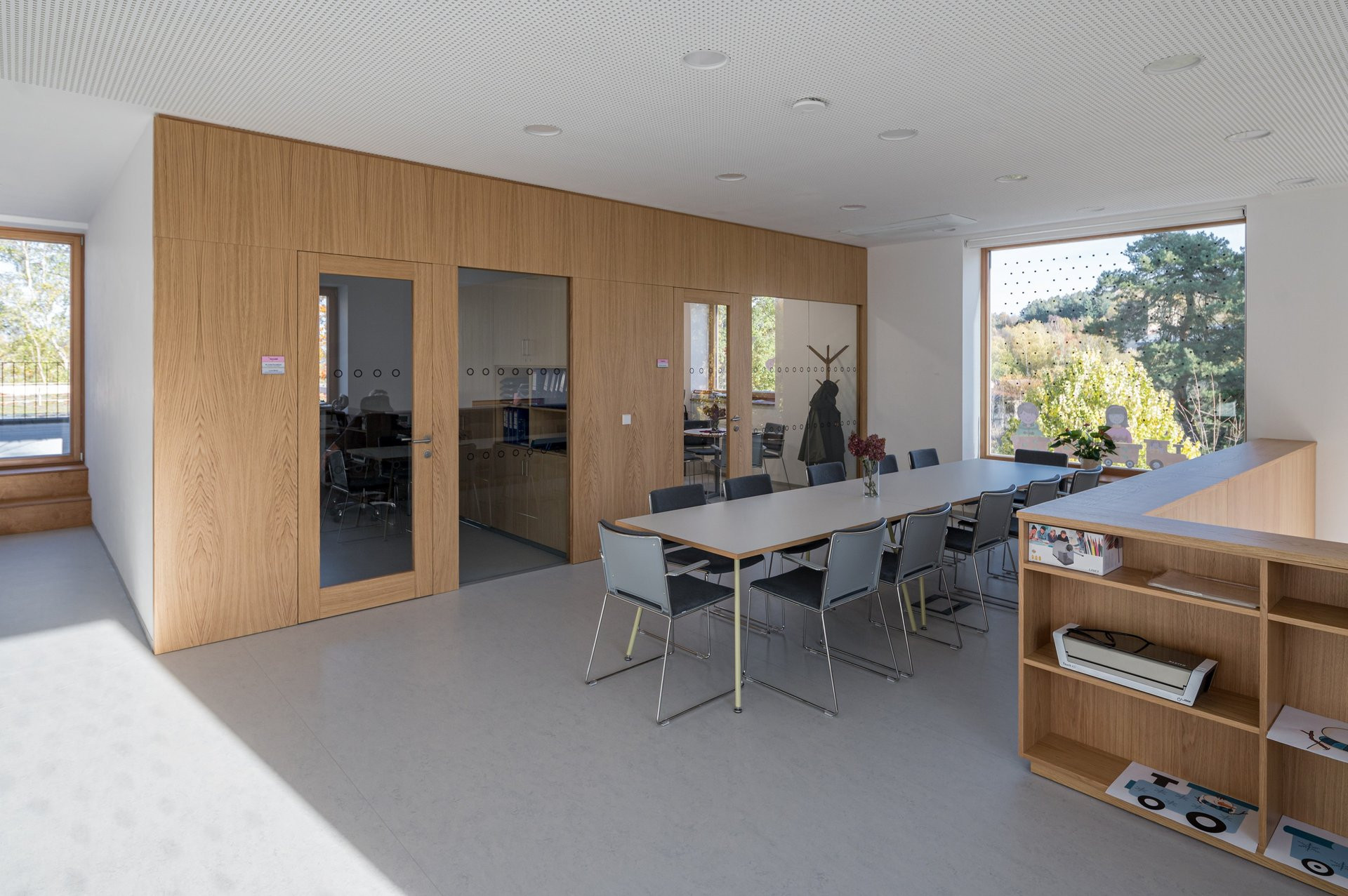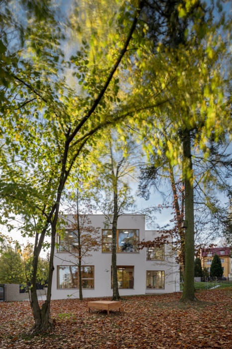 Navrhli jsme „vilu v zahradě“ s několikrát zalomenou fasádou, která se velkými okny otevírá do části parku s největším počtem stromů. Tvarování domu a jeho umístění se vyhýbá kořenovým systémům cenných stromů, které jsou největším bonusem školní zahrady – poskytují dětem stín a přirozená herní zákoutí. Zahrada zabírá polovinu parku, druhá polovina zůstává volně průchozí. Pro dopravní obsluhu slouží stávající komunikace vedoucí k sousedním bytovým domům, doplněná o parkovací stání.