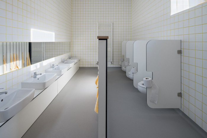 Plot zahrady mateřské školy má v části navazující na chodníky výraznou podezdívku z režných betonových cihel. V interiéru jsou použity převážně přírodní materiály.