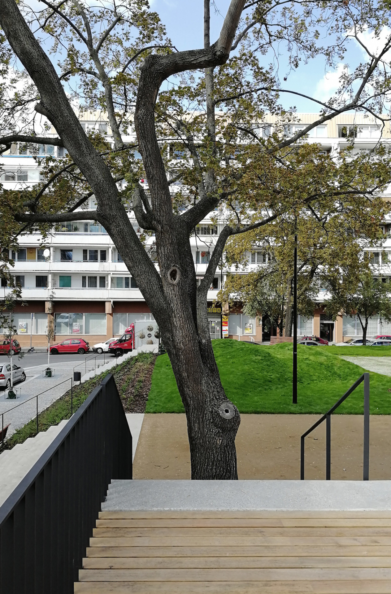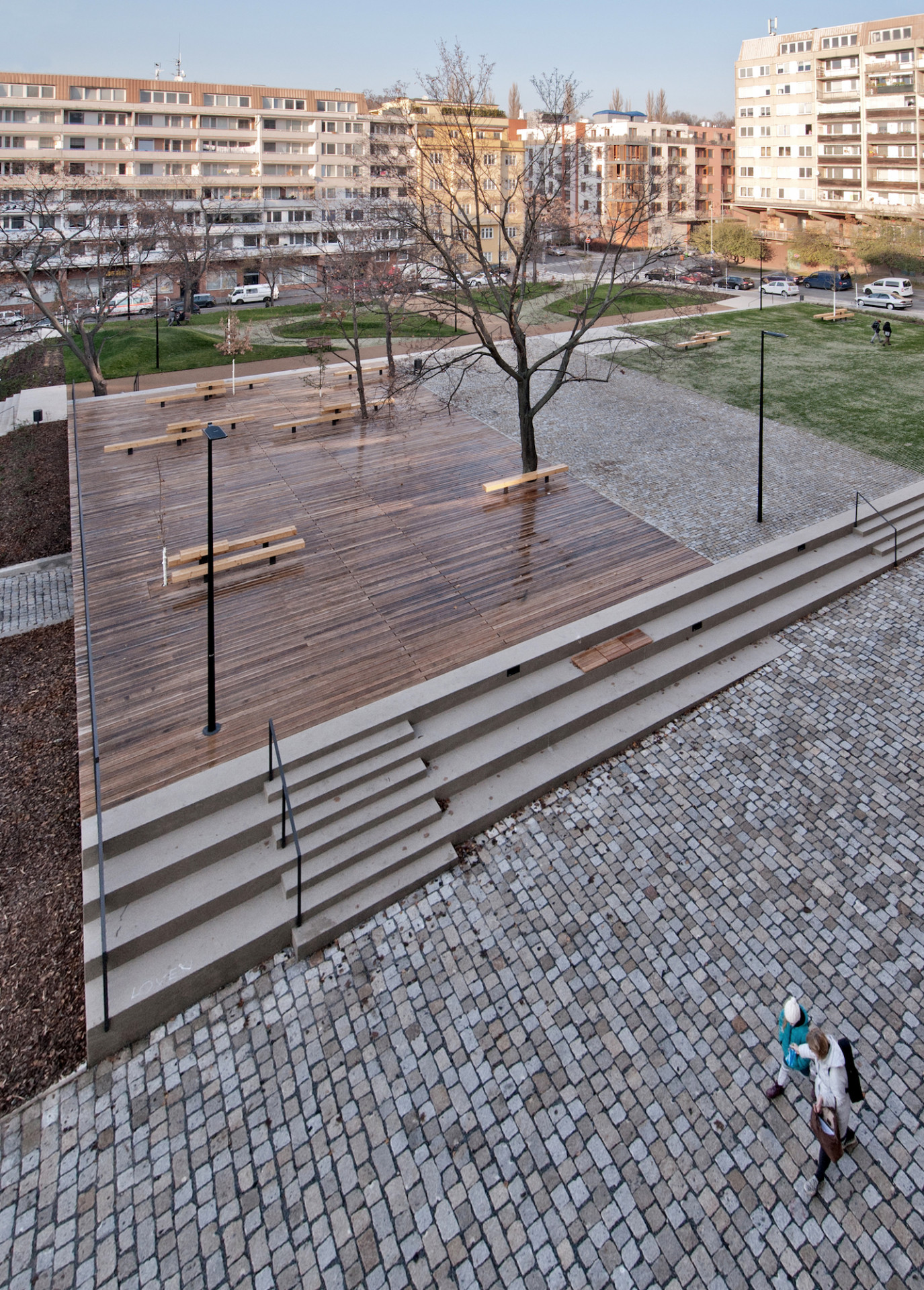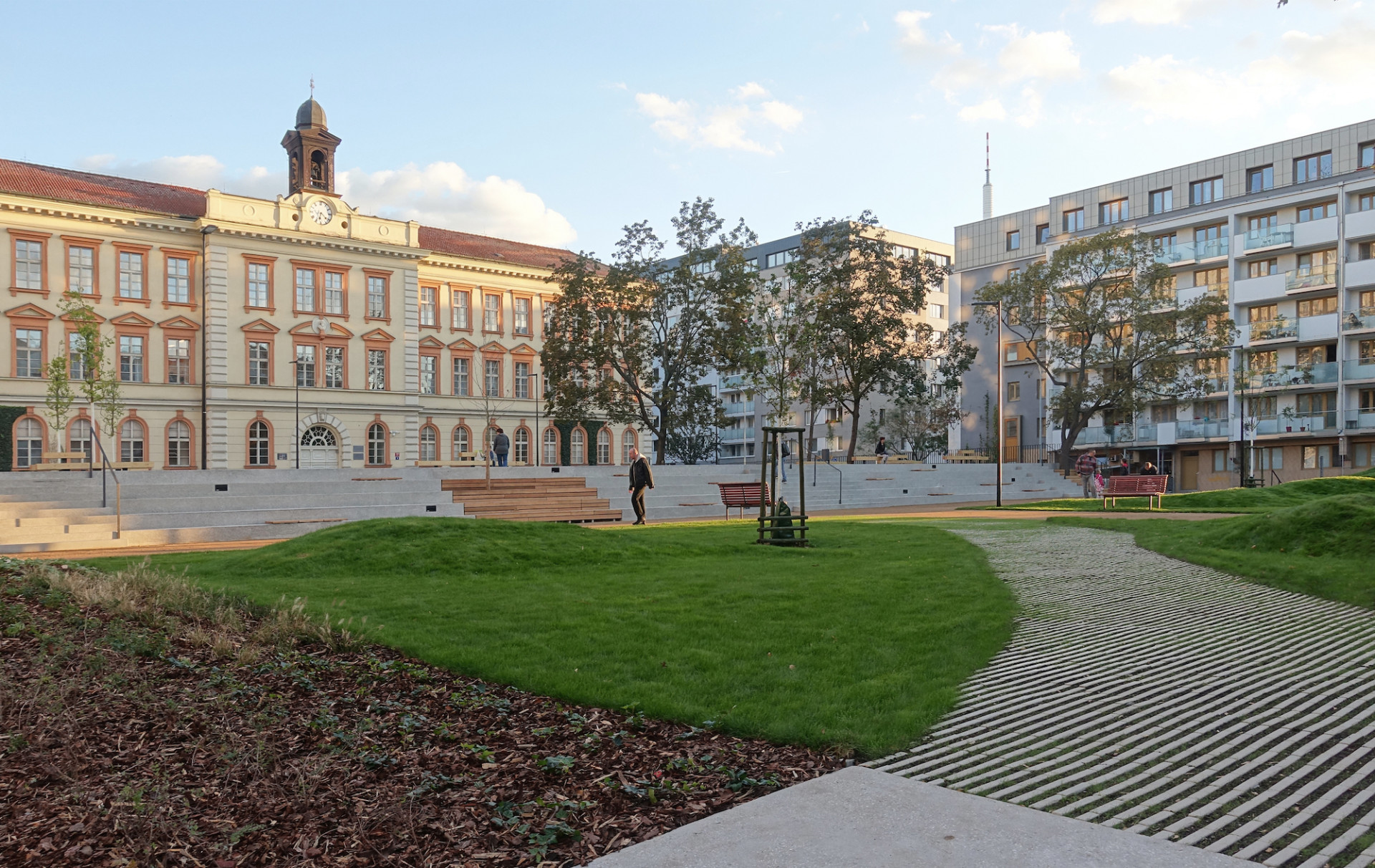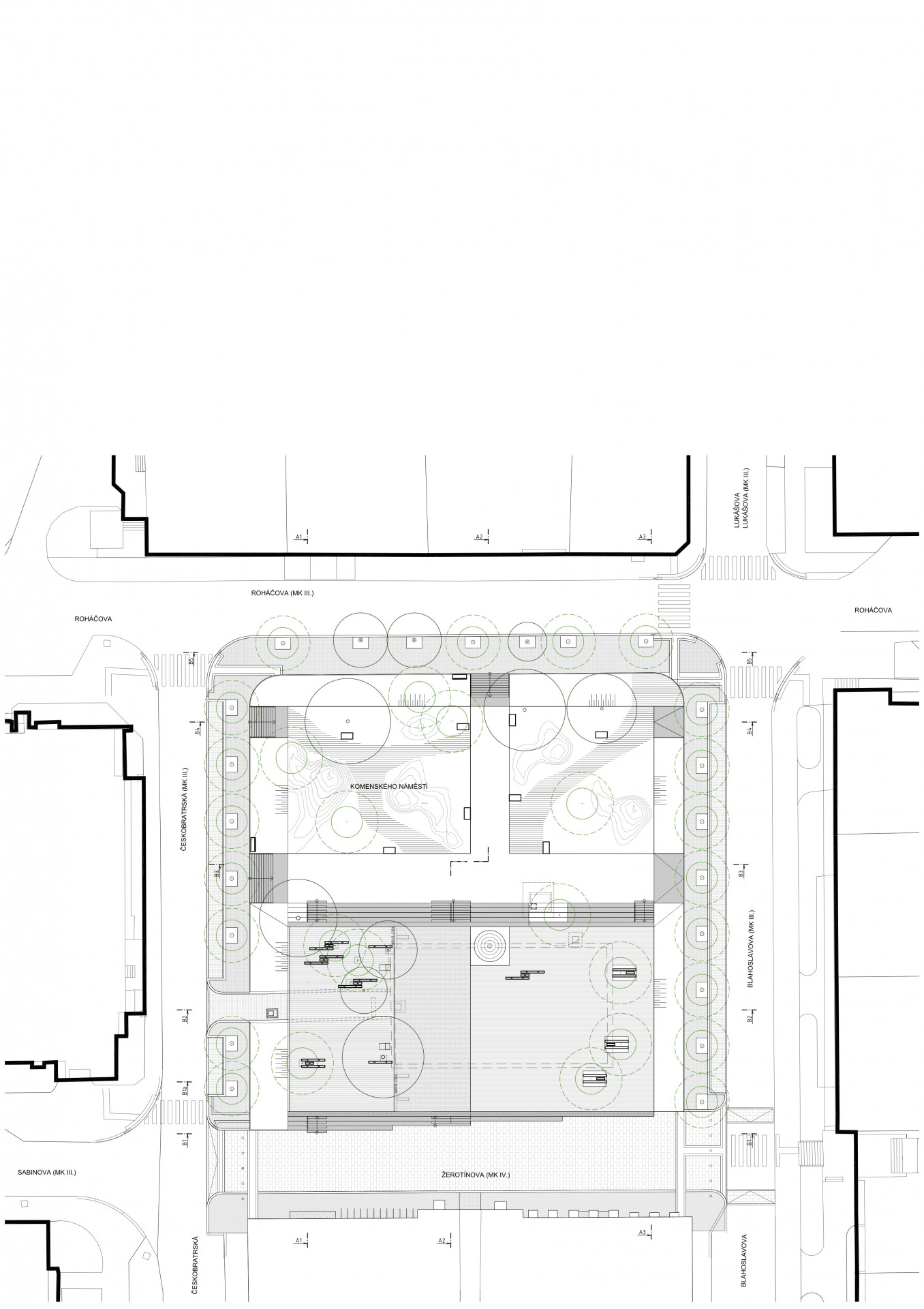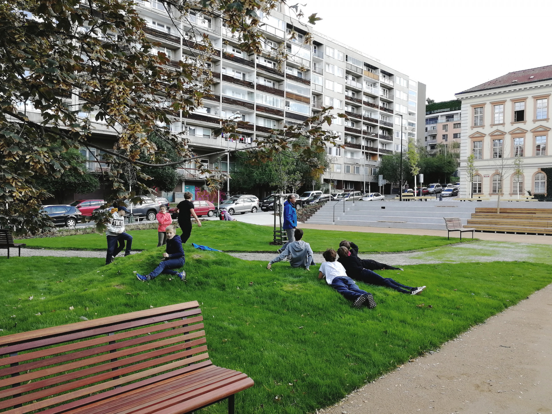 Revitalizací Komenského náměstí jsme chtěli znovu stvořit a uvést do života náměstí, které v poslední době sice neslo takové jméno, ale ve skutečnosti jím vůbec nebylo. Bylo nepřístupným místem, parkovištěm, střechou podzemní stavby. Návrh se musel vypořádat s množstvím determinant. Bylo třeba ponechat kryt civilní obrany, jehož stavba vnesla do náměstí výškové rozdíly, které komplikují připojení prostoru k okolním domům a ulicím. Chtěli jsme zachovat existující stromy – ty ale koření v nepřirozených výškách v návaznosti na výšku krytů. S ohledem na charakter místa, na jeho roli jak v urbanismu, tak životě okolní čtvrti, na lidi, kteří zde žijí, jsme se jednoznačně rozhodli pro náměstí pobytové, civilní, nikoliv primárně reprezentativní. Cílem bylo fyzickými úpravami vytvořit rámec, který nejen umožňuje, ale také iniciuje množství situací, propojujících potřeby lidí a možnosti místa.