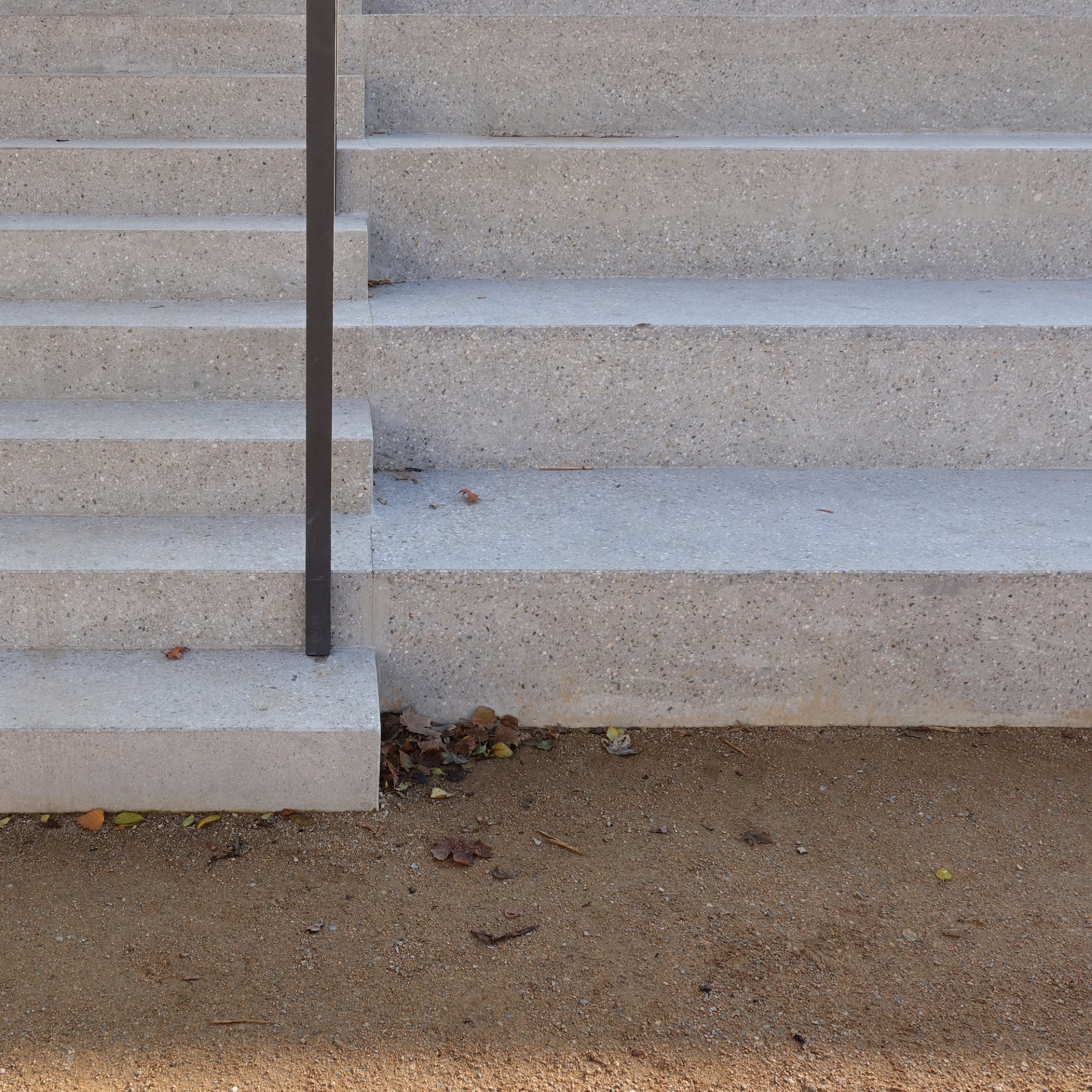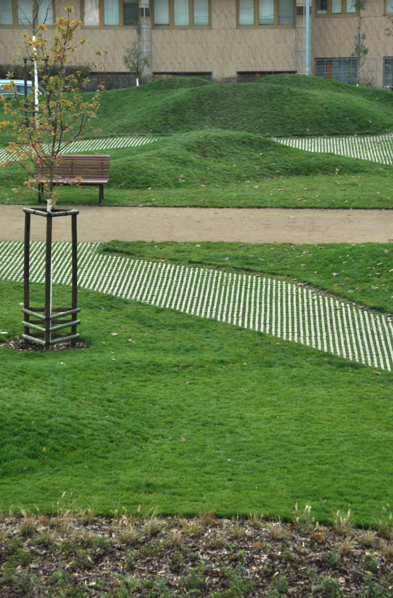 Obývací pokoj před školou. Linky trávy evokují notovou osnovu. Bytí na schodech: Čekání, setkávání, odpočívání. Divadlo: Prostor orámovaný schody k sezení, divadlo každodenních činností i místo pro koncerty, setkání, debatování. „Pramen poznání“: Kamenné a vodní kruhy se odvíjí od symbolu pramene poznání a odkazují na J. A. Komenského. Kopce: Ležení, válení sudů, výhled. Travnaté obliny připomínají českou krajinu - podhůří hor, kde J. A. Komenský navždy opustil Čechy. Hnízda: Stolů, lavic, židlí – pro práci na počítači, čtení, povídání, piknikování, učení se, hraní šachů. Plochy her: Mlatové plochy pro petangue, kuličky, skákání.