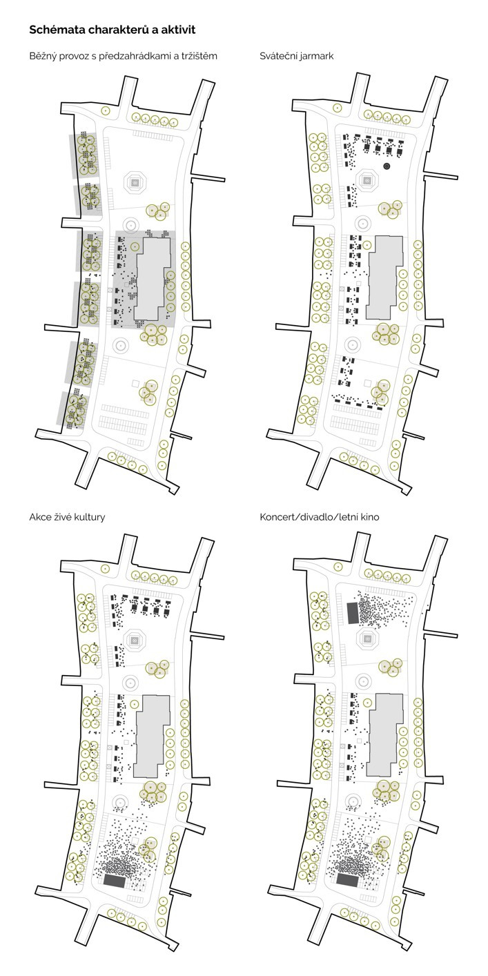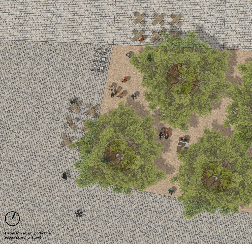 Návrh vytváří jednotný charakter náměstí jako celku, který ale zároveň poskytuje přiměřenou míru detailu, důležitou pro kvalitu obývání místa.