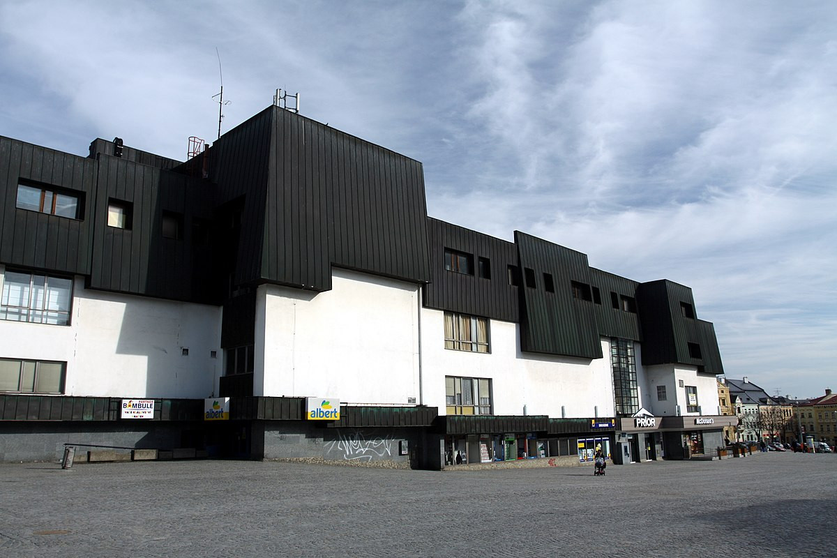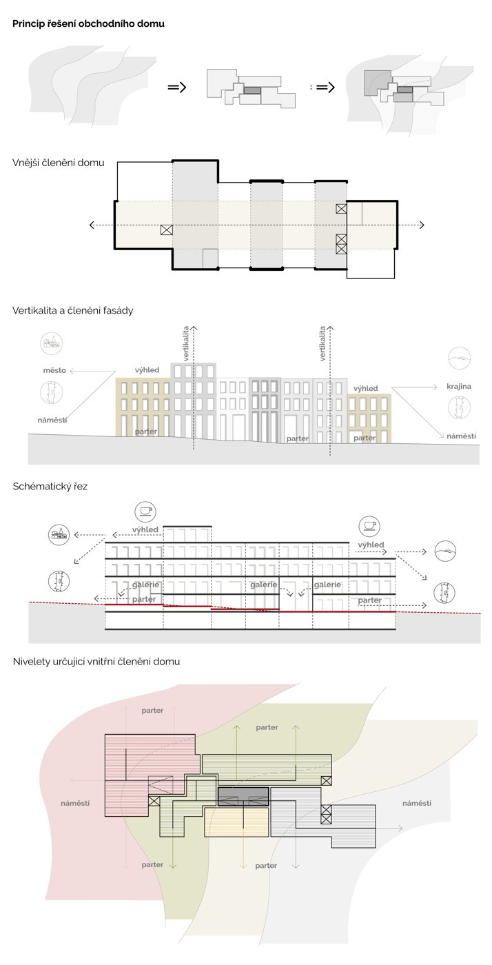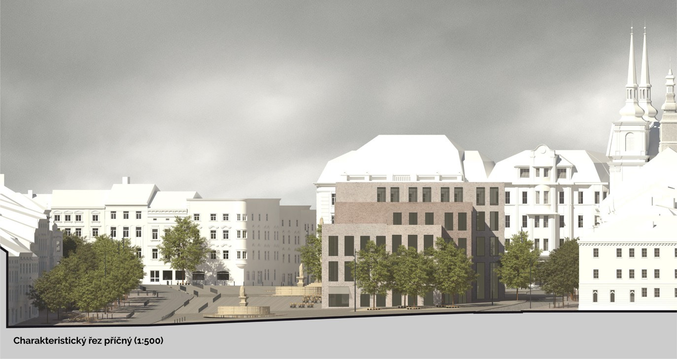 Východiskem úprav je morfologie terénu náměstí. Upravujeme vstupní úroveň domu tak, aby usedl přirozeně do terénu náměstí a mohl s ním i komunikovat po celém obvodu na pobytovém rozhraní. Přízemní prostory se otevírají a propojují s náměstím. Rušíme rampy a příkopy, zásobujeme dům stolovými nákladními výtahy v chodníku. V suterénu tak přibývá prostor pro další obchod a zázemí komplexu obchodního domu.Dům komunikuje vizuálně s kontextem historického místa a doby. Zároveň uživatelsky - otevřením parterů do náměstí