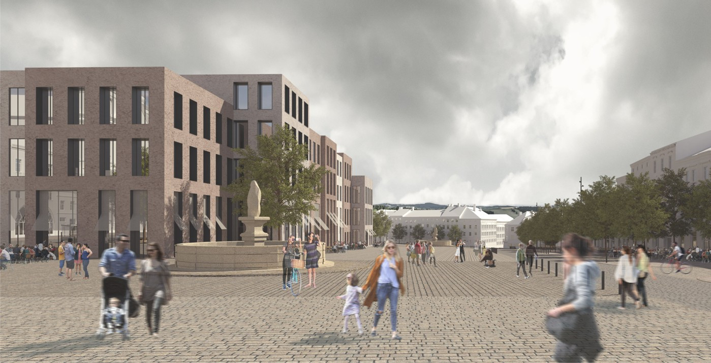 Cílem je posílení charakteru náměstí jako čitelně jednotného celku. Nástrojem je zapojení obvodové fronty domů – funkčně (partery) i významově (pohledy). Použití jednotných principů pro mezo a mikro měřítko. Náměstí výhledů a dějových situací, komponovaných významově, morfologicky, prostorově.