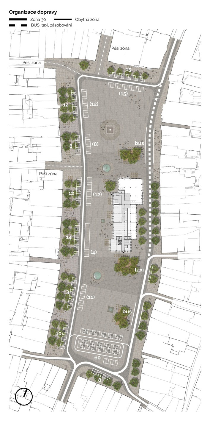 Dopravní zatížení v severojižním směru je tlumeno a rozděleno na pomalejší obvodové komunikace (Zóna 30, nebo obytná zóna). Západní linie obsluhuje partery domů, východní odkloněná linie slouží primárně pro městskou hromadnou dopravu. Napravuje se tak situace, kde vedení cest je reliktem náměstí průjezdného hlavním tahem dopravy. Doprava v klidu je pravidelně rozptýlena v rámci celé plochy. Variabilita parkování při západní straně umožňuje pohodlnou obsluhu středu náměstí v době trhů.