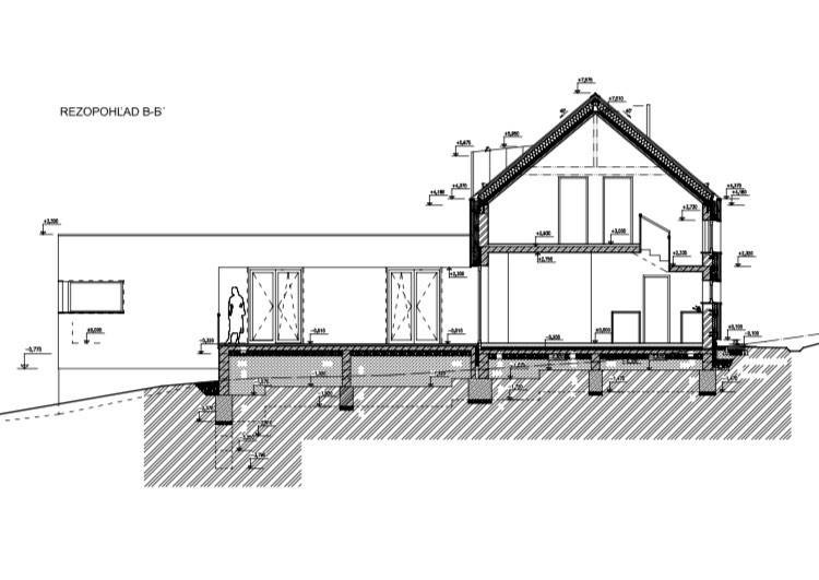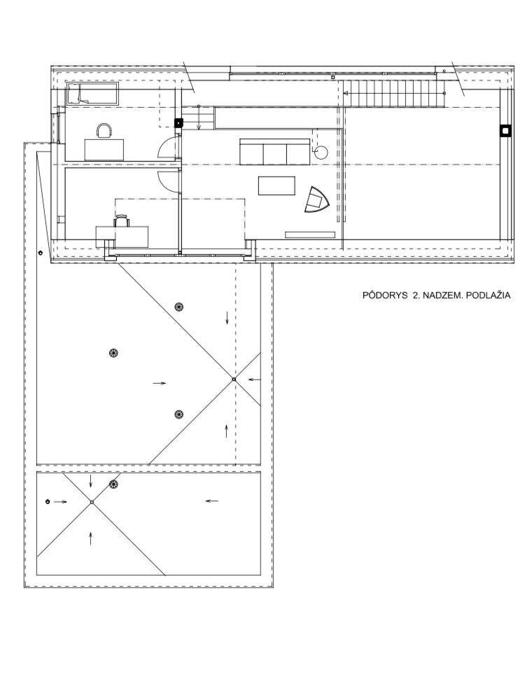 Dom je posunutý k južnej hranici pozemku s výmerou takmer 1800 m2. Konfigurácia pôvodného terénu bola východiskom pre dvojúrovňové využitie parcely. Garáž, sprístupnená komunikáciou prebiehajúcou pozdĺž východnej hrany parcely, tvorí podnož pre nočnú časť domu. Elkový pôdorys, ktorý sa rozvíja na vyššej úrovni, je z východnej časti ohraničený vyššou, dennou časťou domu so sedlovou strechou. Tá zároveň tvorí pohľadovú bariéru pre otvorený segment záhrady. Betónová terasa, “zovretá” oboma traktami domu, sa otvára na juhozápad. Výhľad na okolité lúky nerušia žiadni susedia.