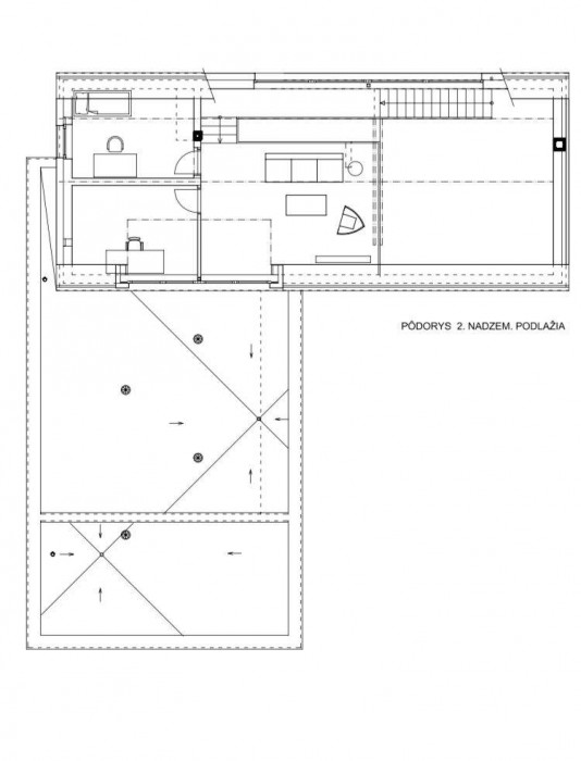 Príjemnú sivú patinu dreva, použitého na fasáde dennej časti domu, striedajú precízne monochromatické plochy nižšieho traktu. Bezpresahová strecha a skryté žľaby nechávajú vyniknúť kompozíciu dvojice blokov. Priestorový koncept je obohatený o prevýšenú zónu obývacej izby, otvorenú na celú výšku krovu.
