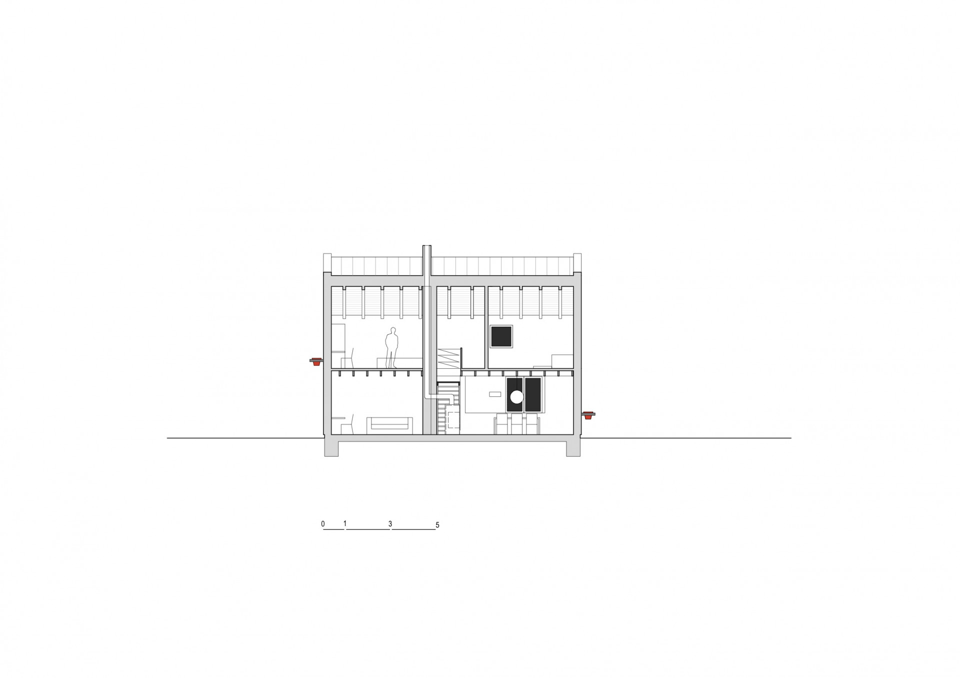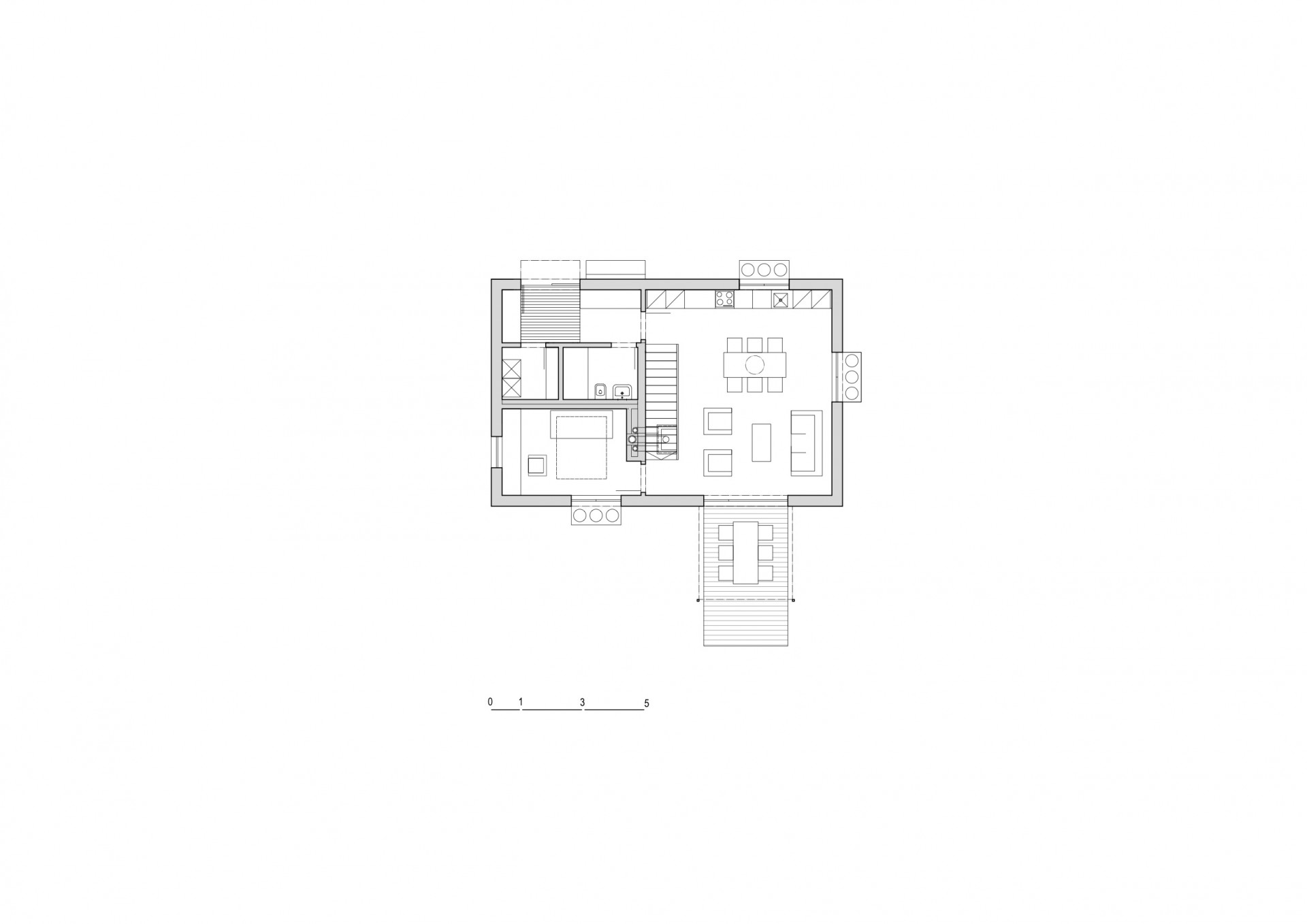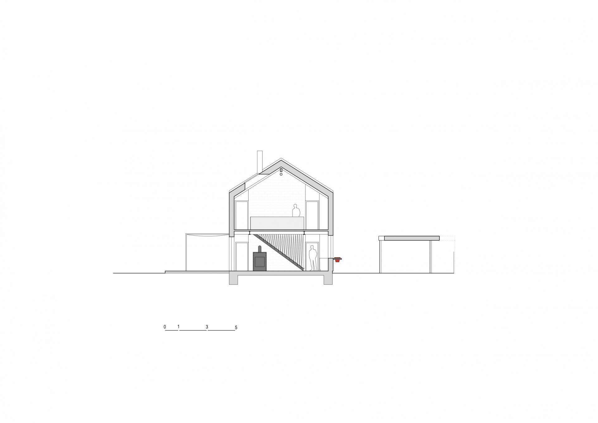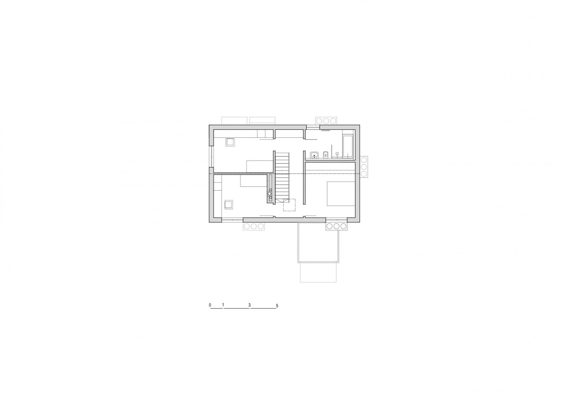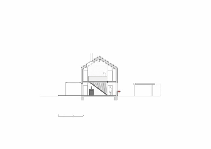 Jednoduché dispoziční řešení nabízí v přízemí vše potřebné pro společný život čtyřčlenné rodiny, v patře pak jednotlivé pokoje. K domu přináleží přístavek poskytující přístřeší autu a úkryt kolům a malé dílničce v úrovni terénu, v podzemí pak správnou teplotu bramborám i plzeňské dvanáctce nebo speciálům z místního minipivovaru.