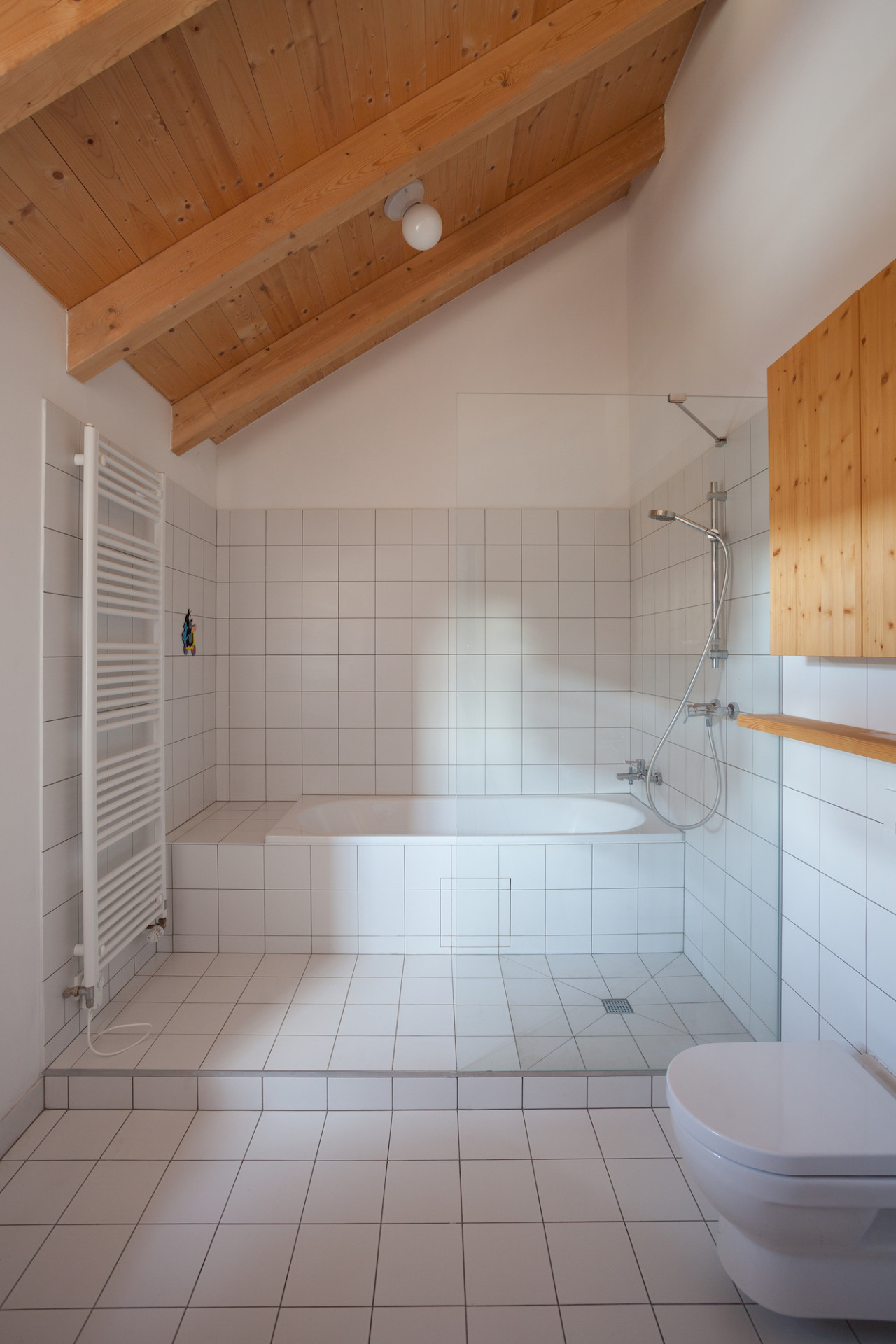 Konstrukční princip domu – dřevostavba – se v interiéru projevuje přiznanými trámy stropu i střechy, v exteriéru obkladem z nehoblovaných modřínových prken. Lehkou dřevostavbu pocitově „ukotvuje“ stěna z betonových tvárnic ve středu domu, která má současně akumulační funkci – ta by se měla ještě znásobit po osazení krbových kamínek. Okna jsou dřevohliníková, stíněná screeny, jako zábradlí v nich slouží ocelové madlo s vypnutou textilní sítí. Stejně je provedeno i zábradlí vnitřního schodiště, jehož síť je nejlepší výstavní plochou pro malířské výtvory obou dětí.Časem se podaří zrealizovat i kamennou terasu nebo dřevěné molo před oknem obývacího pokoje kryté textilií vypnutou v ocelové konstrukci. Momentálně docela dobře postačuje plachta z Hornbachu.