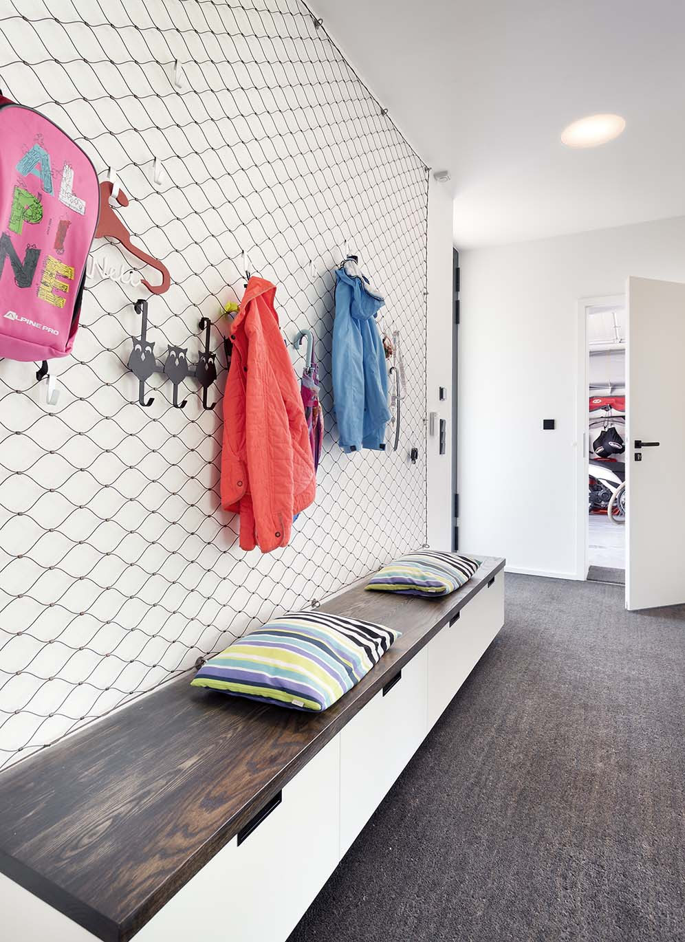 Barevně neutrální ladění domu ponechává volné pole pro dotvoření domu jeho obyvatelům. Bílé plochy jsou doplněny černými kovovými prvky v podobě hliníkových oken, kování, ocelových sítí zábradlí a dalších interiérových prvků.