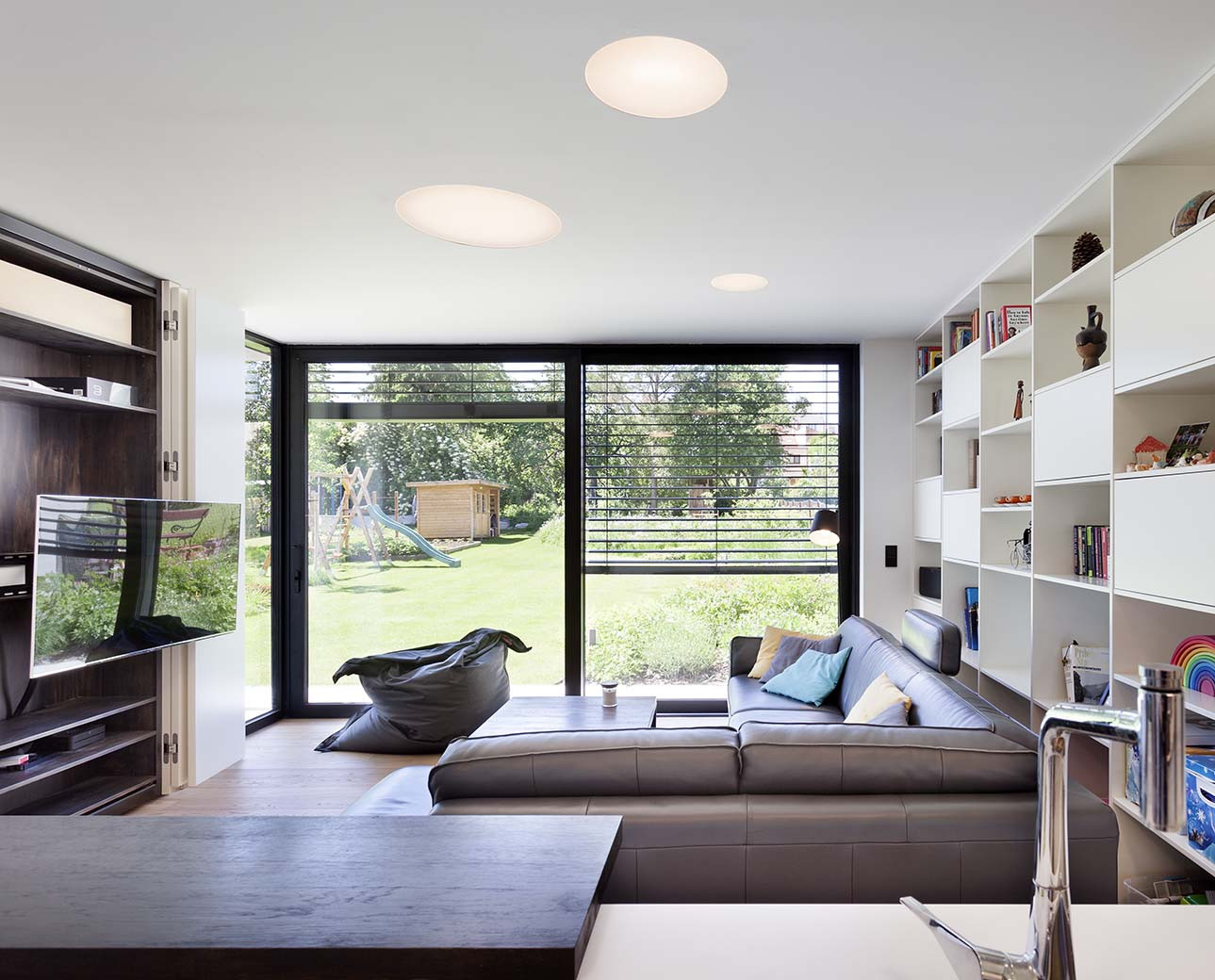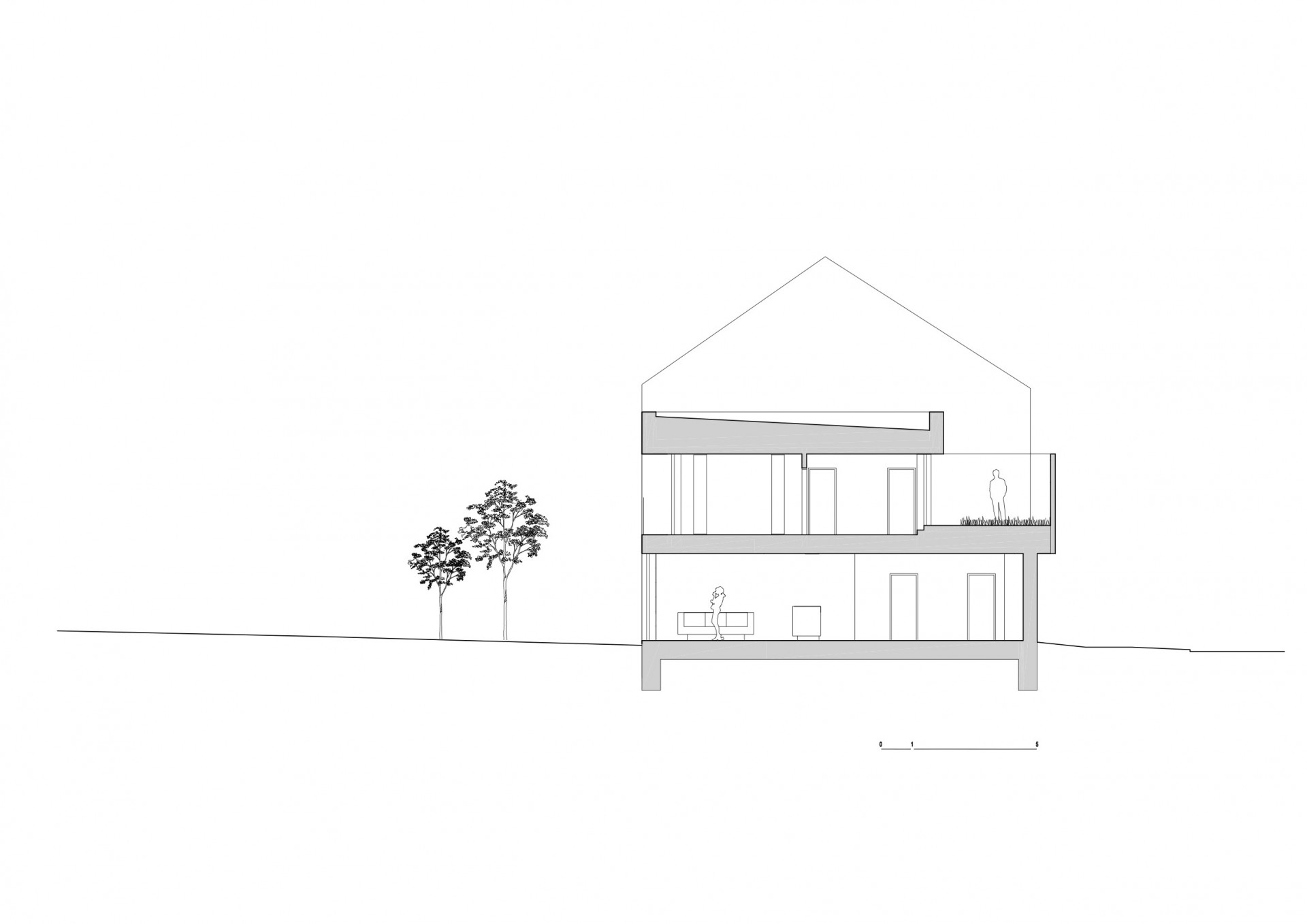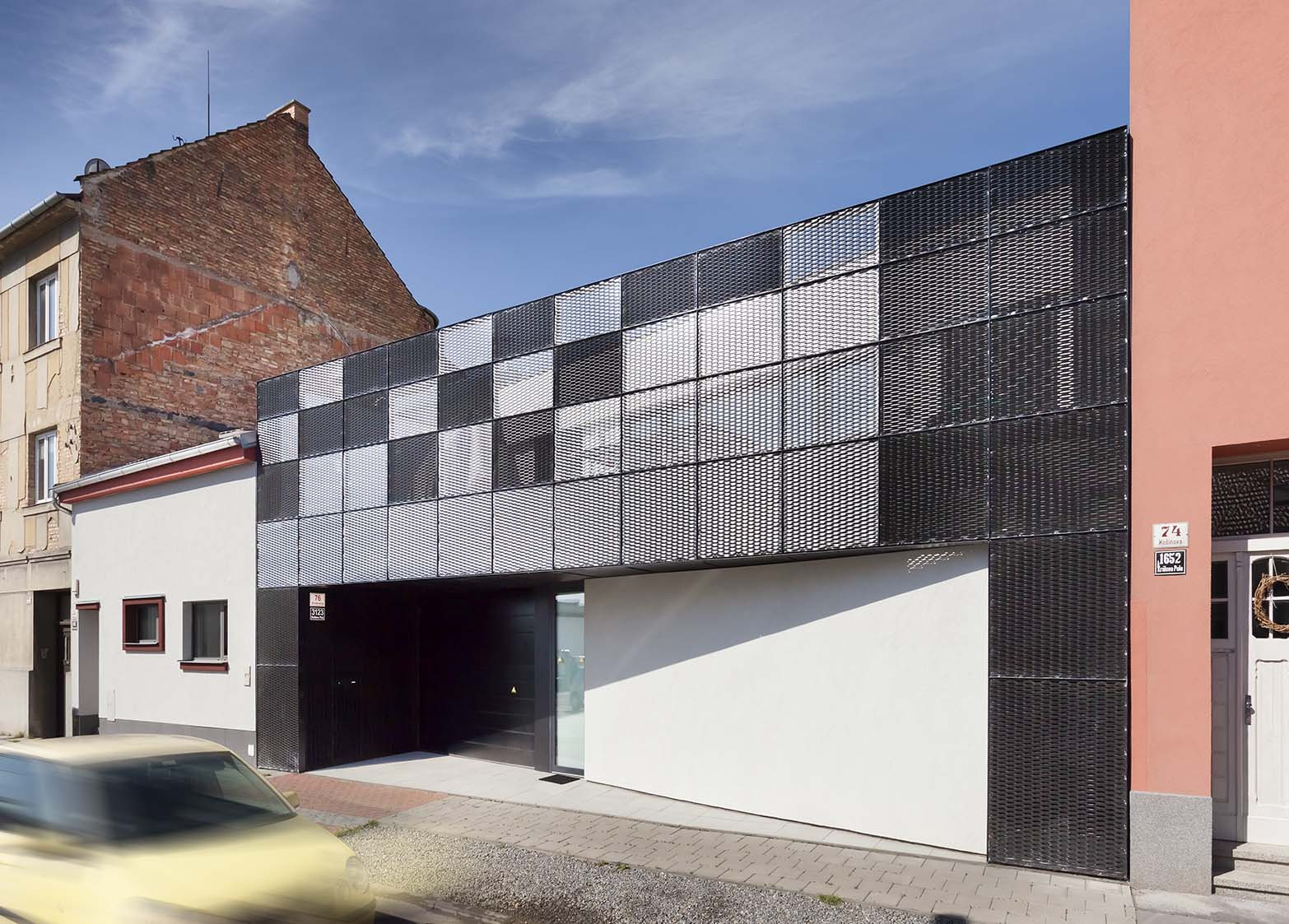Do uličního prostoru se dům v přízemí uzavírá, s výjimkou vstupních dveří a garážových vrat. Vstup je zdůrazněn šikmým zářezem do hmoty objektu, který jej současně kryje před deštěm. Za perforovanou ocelovou stěnou držící uliční čáru se v patře skrývá venkovní prostor umožňující velkorysá prosklení pokoje i koupelny orientované do ulice bez ztráty soukromí. I místnosti směřované do ulice tak mají svůj „kus venku“. Venkovní plocha může být zahradou nebo hrací plochou dle preferencí obyvatel domu. Obytnou částí v přízemí a třemi pokoji v patře se dům otevírá západním směrem do zahrady.