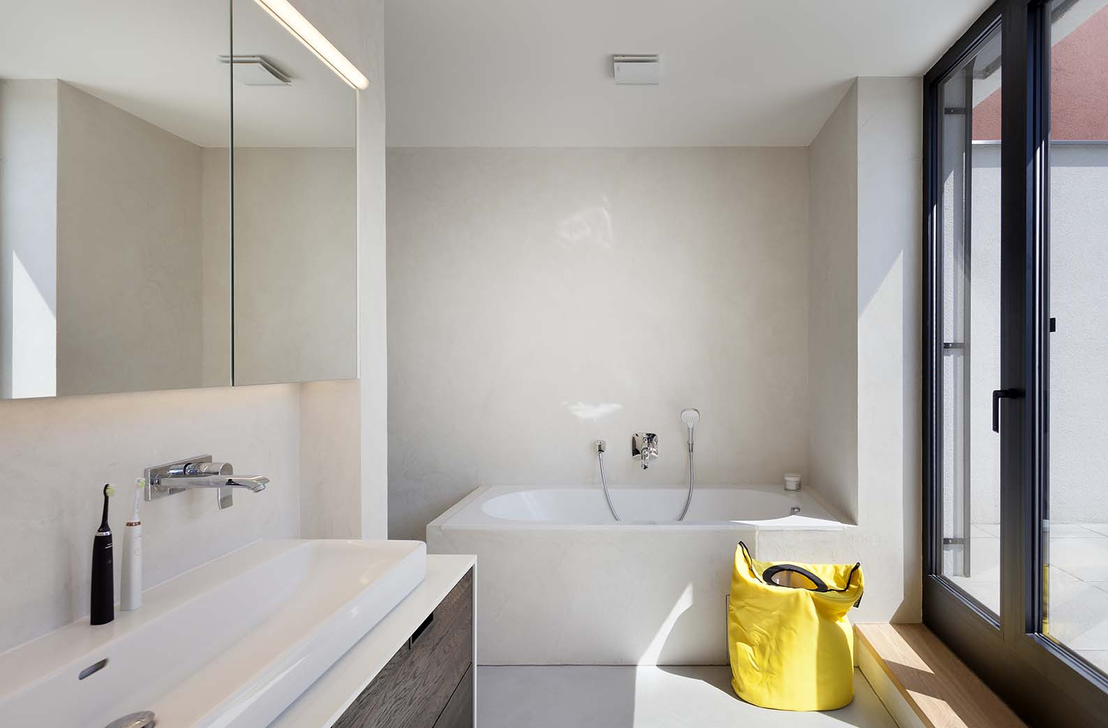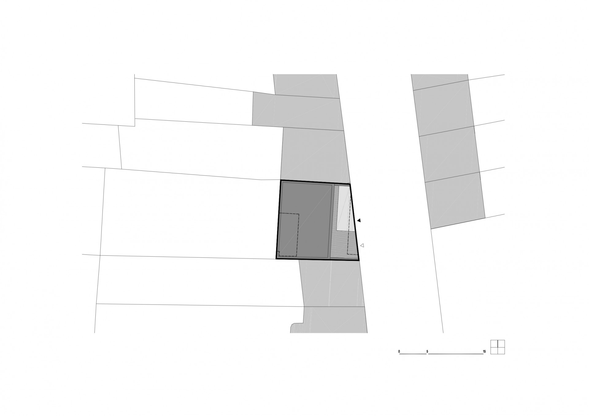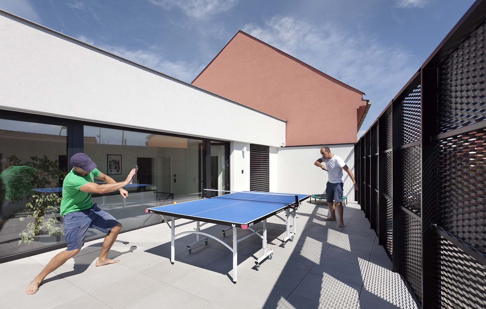 Větší hloubka domu založená na těchto návaznostech je využita k vytvoření polosoukromého venkovního prostoru v patře orientovaného do ulice a kryté terasy v přízemí zapuštěné do domu navazující na hlavní obytný prostor. Těmito „výkusy“ z hmoty domu a umístěním schodiště v jeho středu je prosvětlena hlubší dispozice přízemí.