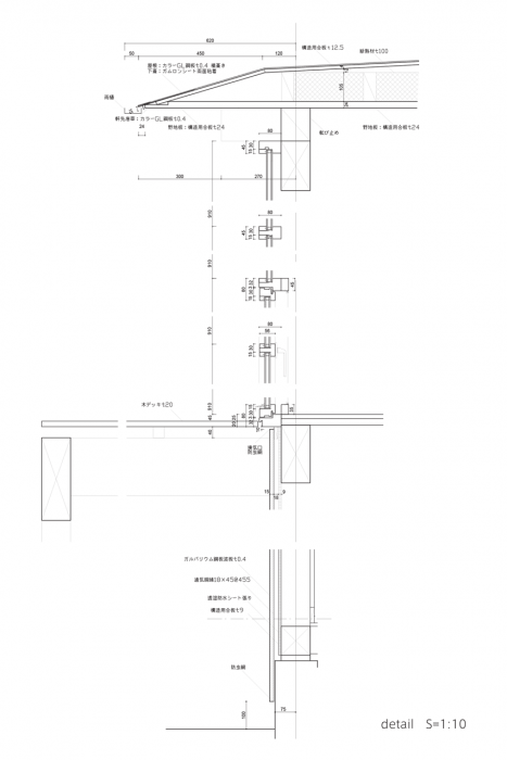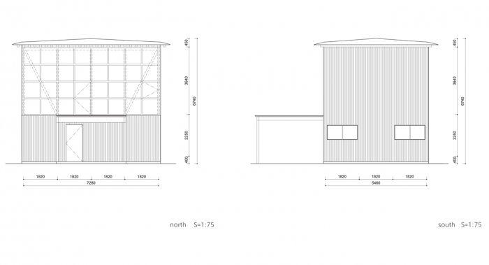 Co se týče půdorysu, čtverce jeho sítě mají rozměry 3 shaku x 3 shaku (910 x 910 mm). Půdorys má rozměry 6 x 8 čtverců a také místnosti jsou podle těchto čtverců rozděleny. Výšku jednoho podlaží jsme jednoduše stanovili na 4 čtverce (=2 žíněnky Tatami). Krokve tvoří masově produkované, šest metrů dlouhé hranoly (120 x 120 mm, obyčejně používané na sloupy) a použili jsme je tak, jak přišly – aniž bychom je řezali. Přečnívající části tvoří přesah střechy. Rozměry domu jsou odvislé od masově vyráběných komponentů, což ho dělá velice cenově přístupným. Co se týče působení, živost přichází skrze „fyzický materiál“. A co se týče prožitku, konstrukce je založena na modulárním systému, na nějž jsme byli v Japonsku všichni zvyklí, což přináší jistý faktor nostalgického komfortu.