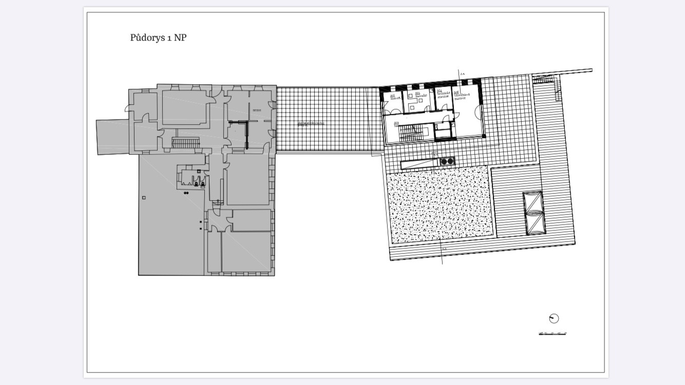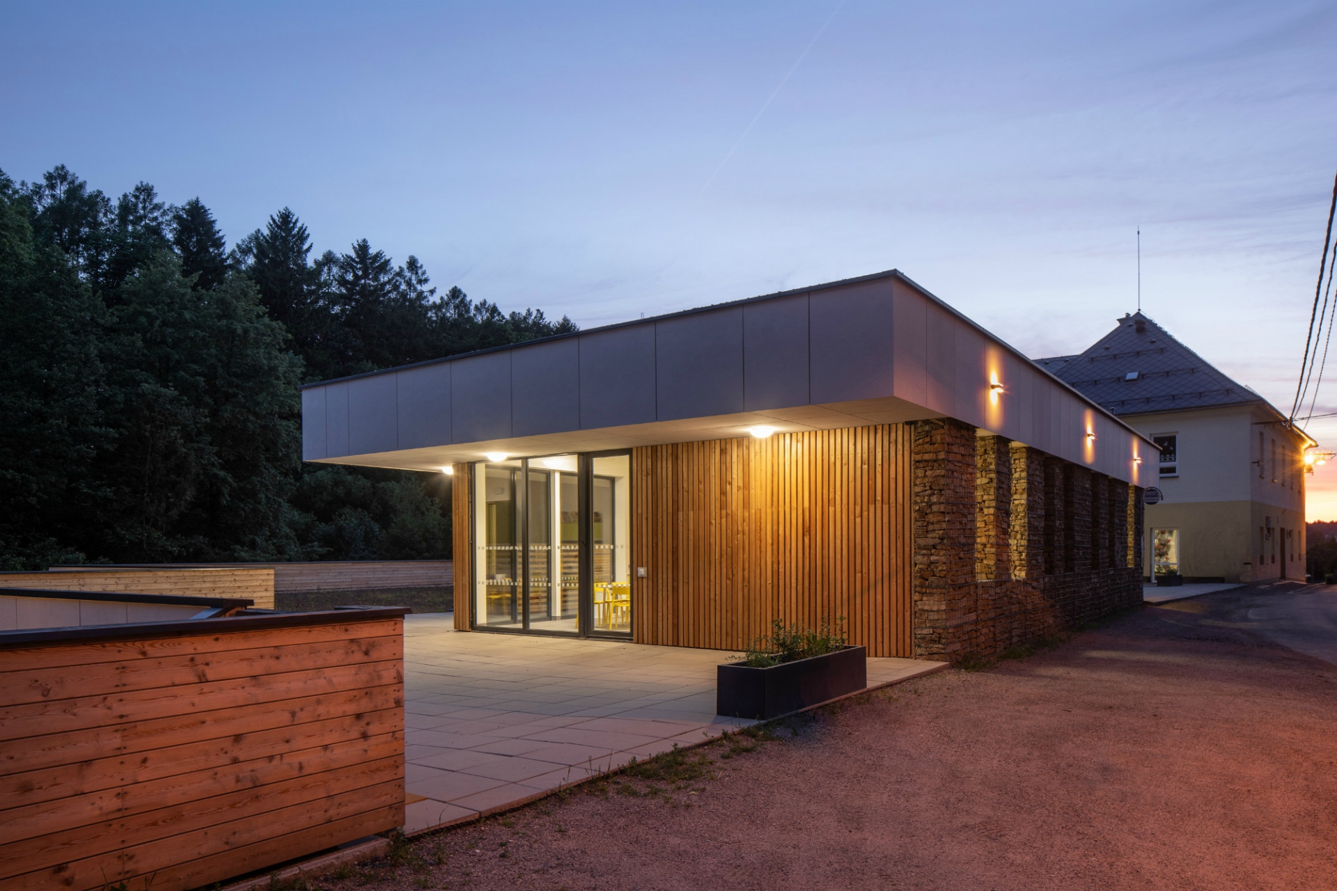 Vstup do školky s velkým přesahem střechy je zároveň místem, kam je možné se ukrýt před deštěm při čekání na autobus. Střechu školní jídelny jsme navrhli tak, aby lákala děti čekající na autobus, aby neběhaly přímo po silnici, jak se doposud dělo. Materiály vstupní stavby školky jsme volili s ohledem na okolí. Pískovcová gabionová zeď, je zrcadlem pískovcové zdi hřbitova. Světle béžová barva obkladu odkazuje na barevné provedení kostela. Dřevěný obklad, který necháváme přírodně zestárnout je odkazem na dřevěné hospodářské části fary. Střecha, která je osázená sukulentní vegetací, se bude při pohledu ze hřbitova ztrácet oproti okolní vegetaci.