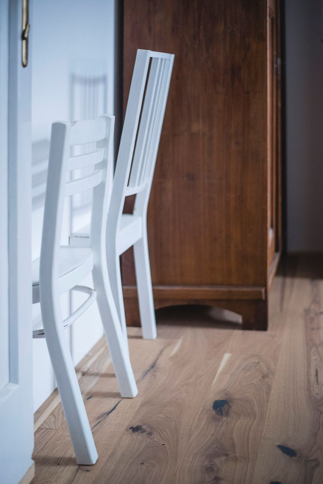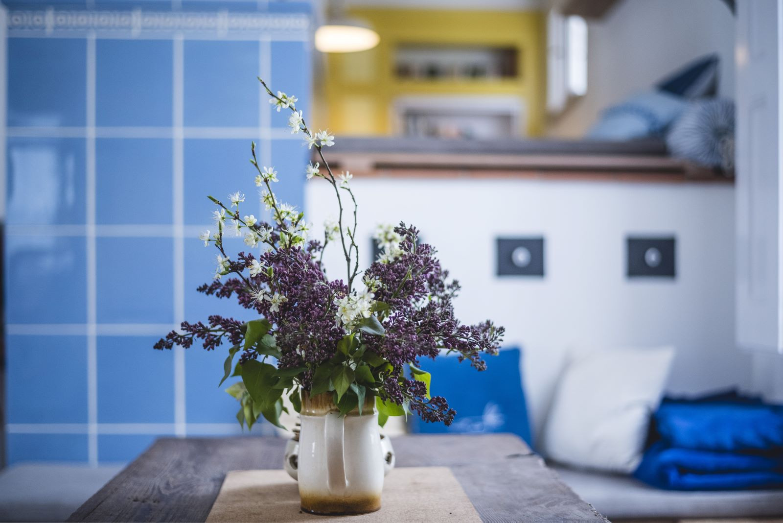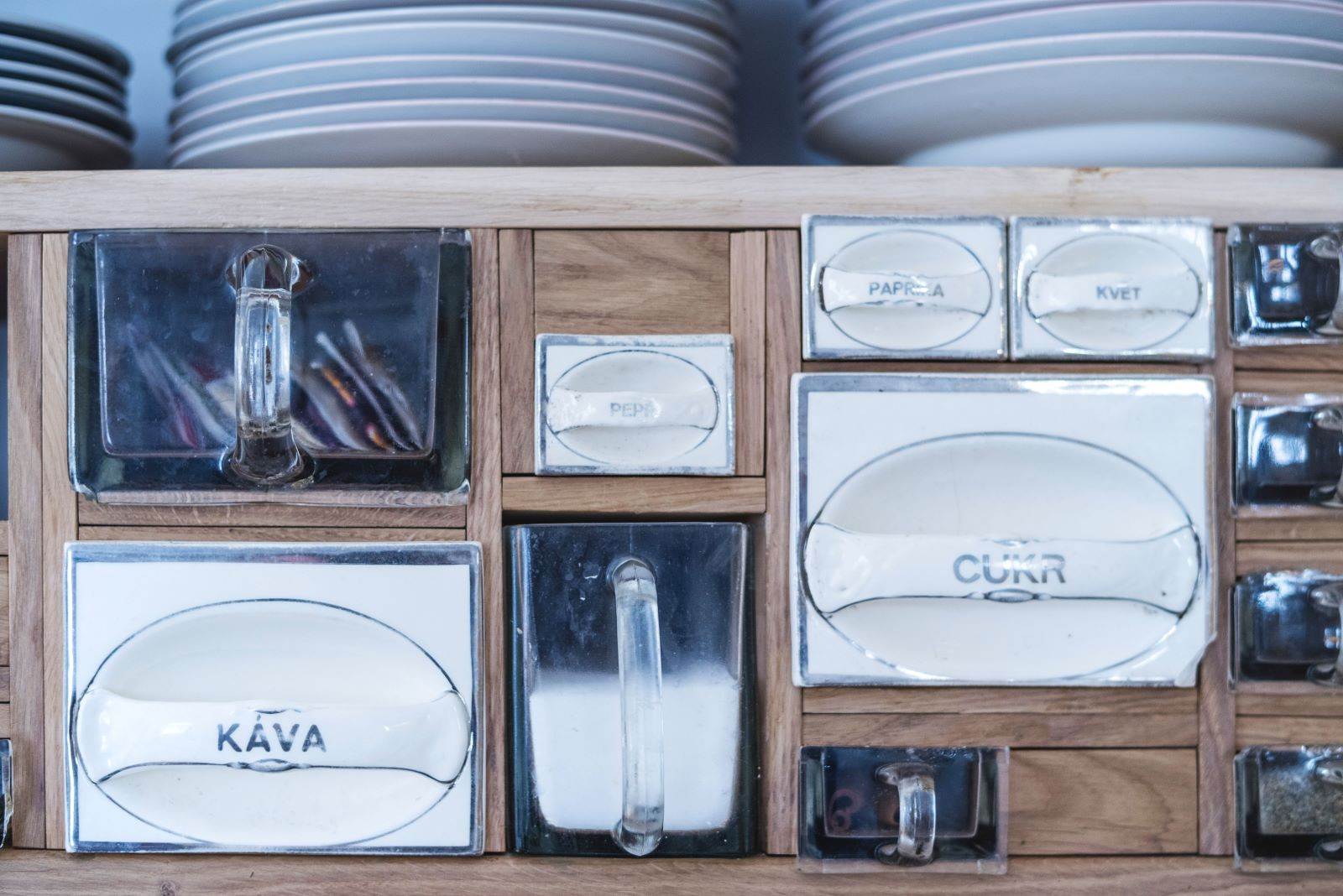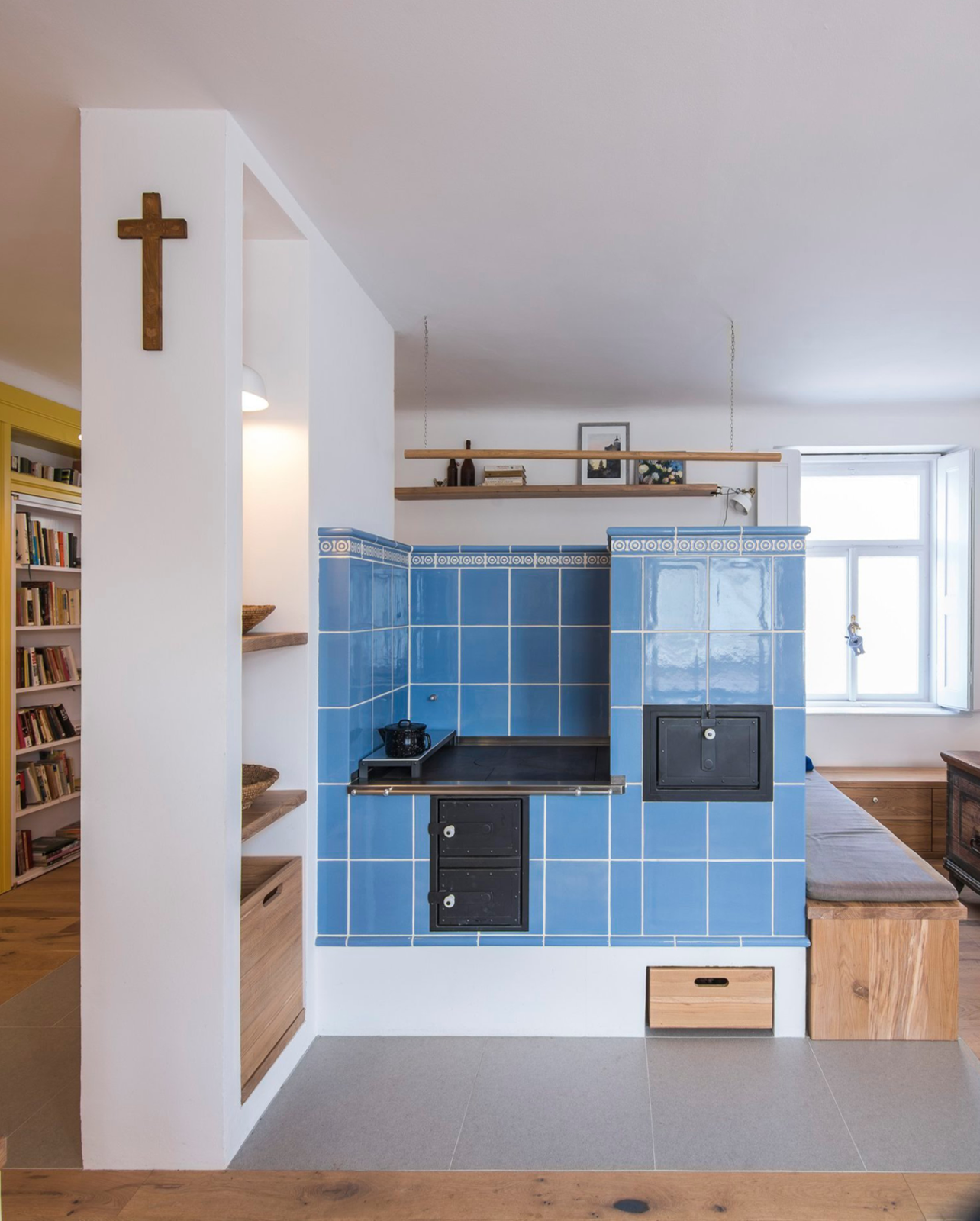 Podobně jsou použity i skleněné a porcelánové nádoby v kuchyňské skříňce nebo hrnce na kysané zelí coby noční stolky. Nové dubové prvky jsou vyrobeny ze stromu, který před lety během bouřky spadl na pozemku majitele a léta se sušil ve stodole.