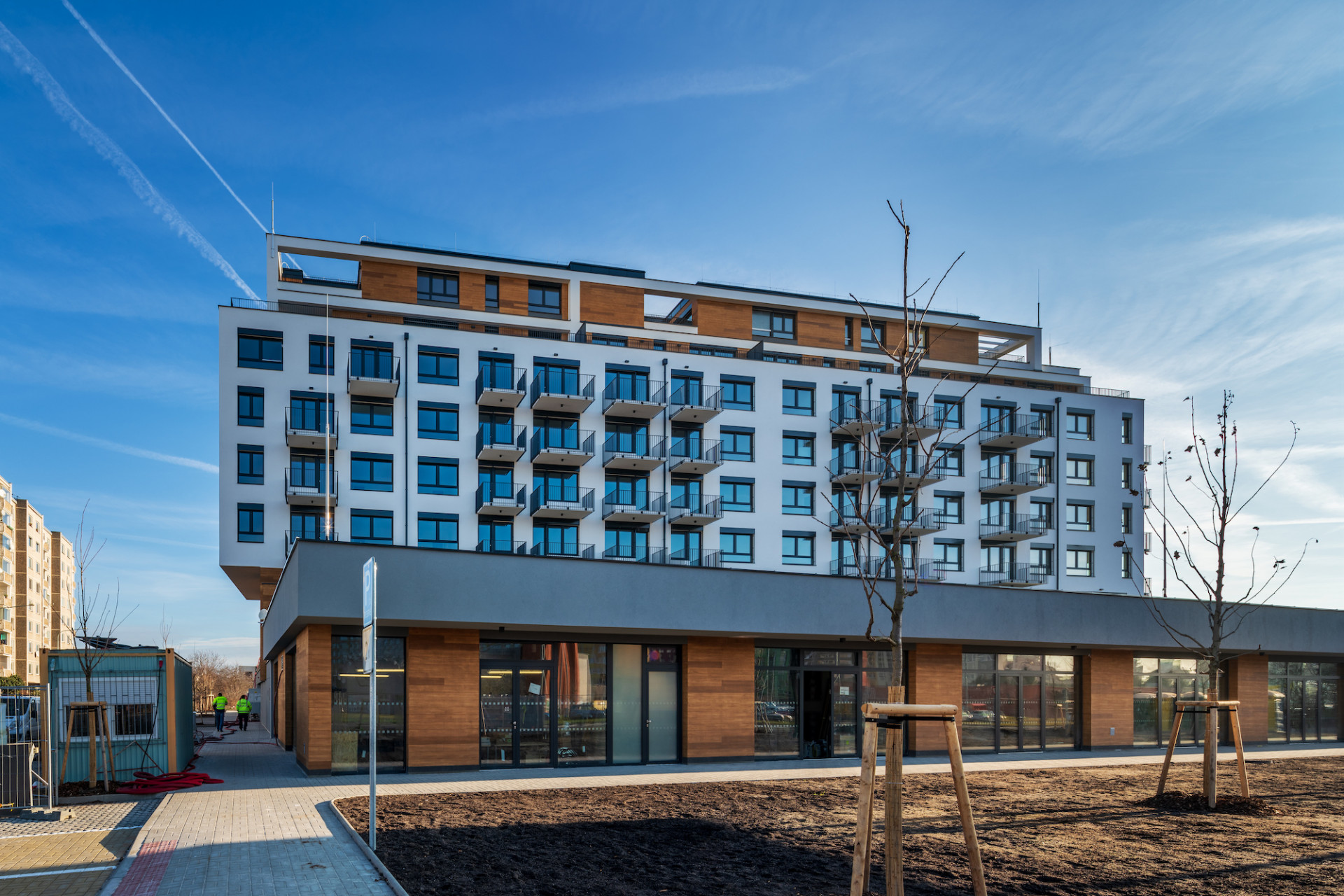 Noví obyvatelé naleznou v příjemném stínu východní fasády prostorné předzahrádky, dětské hřiště i komunitní zahradu s možností pěstování plodin. Pozornosti místních ani kolemjdoucích neujde rozmanitá kompozice střešních teras ani nový veřejný prostor a místo k setkávání před aktivním parterem při západní fasádě domu s nejrůznějšími obchody a službami. Hlavní obytná část novostavby vyrůstá z podnože částečně vystupující hmoty podzemních garáží a předsazeného parteru. Soklová část je od té obytné oddělena pohledovým betonem, gabionovými stěnami, popínavou zelení a tmavými odstíny fasádní omítky evokující strukturu dřeva.