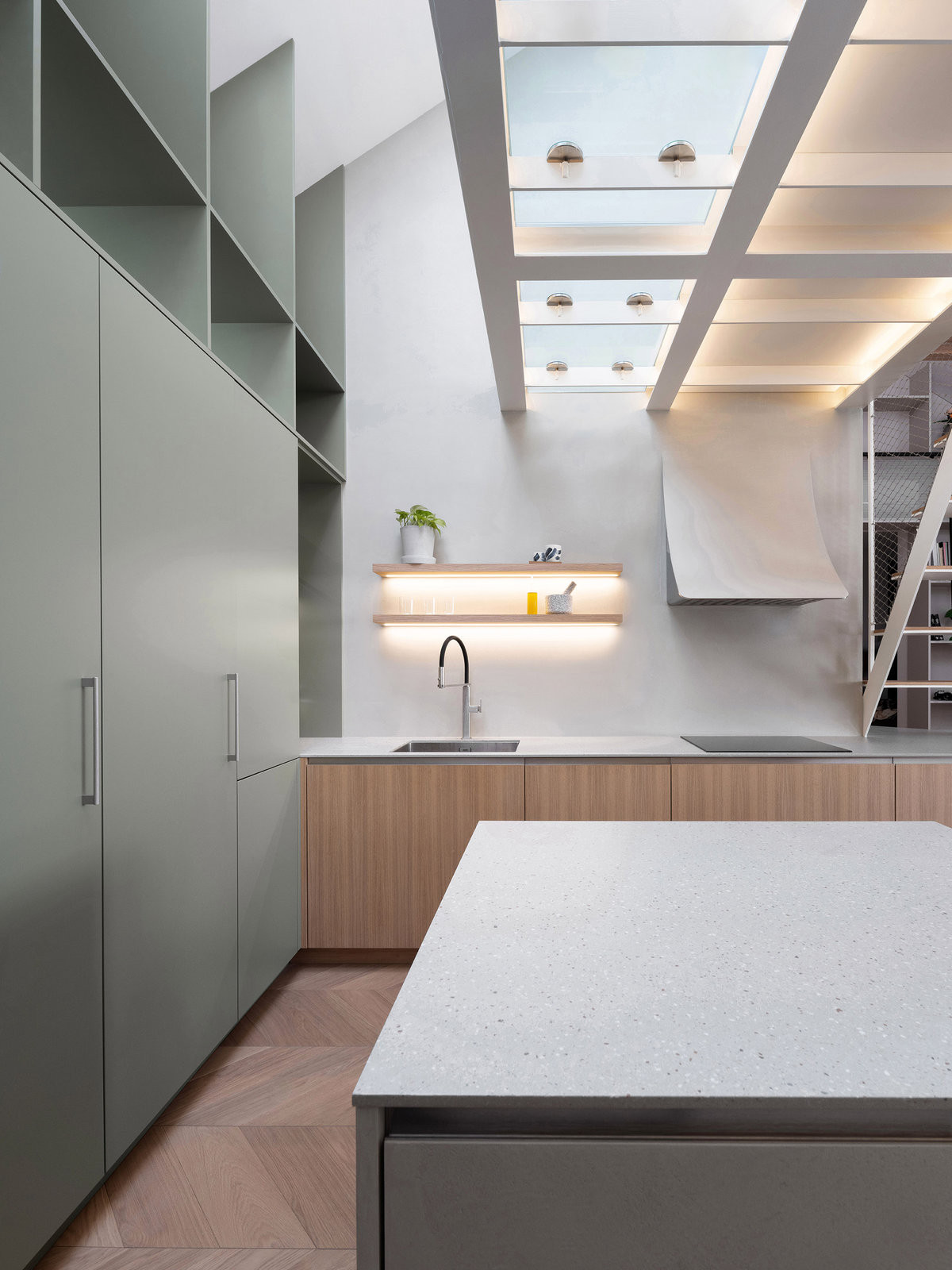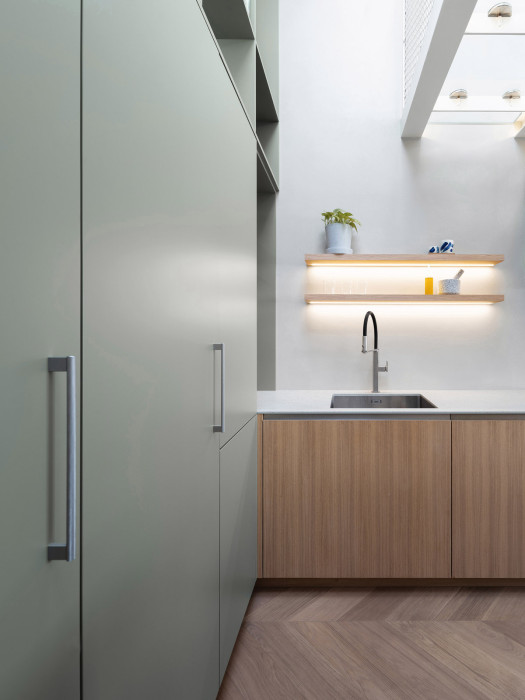 Jako hlavní stavební materiál projektu byla použita dýha a lakovaná MDF. Doplňkově pak umělý kámen Corian, ocel, sklo a čalouněné prvky. Důraz byl kladen na přesnost provedení, čistotu napojení jednotlivých komponent a celkovou soudržnost s architektonickým konceptem. Povrchové úpravy a barevnost odpovídají světle laděnému interiéru, který zdůrazňuje přirozenou texturu dřeva a denní světlo pronikající střešními okny.
