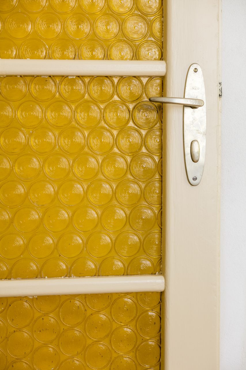 Architekti zhodnotili co nejvíce původních prvků bytu a jejich zásahy vstupují neinvazivně. Příkladem je barevná návaznost kuchyně a terrazza, nebo prosté zařízení obytných místností.