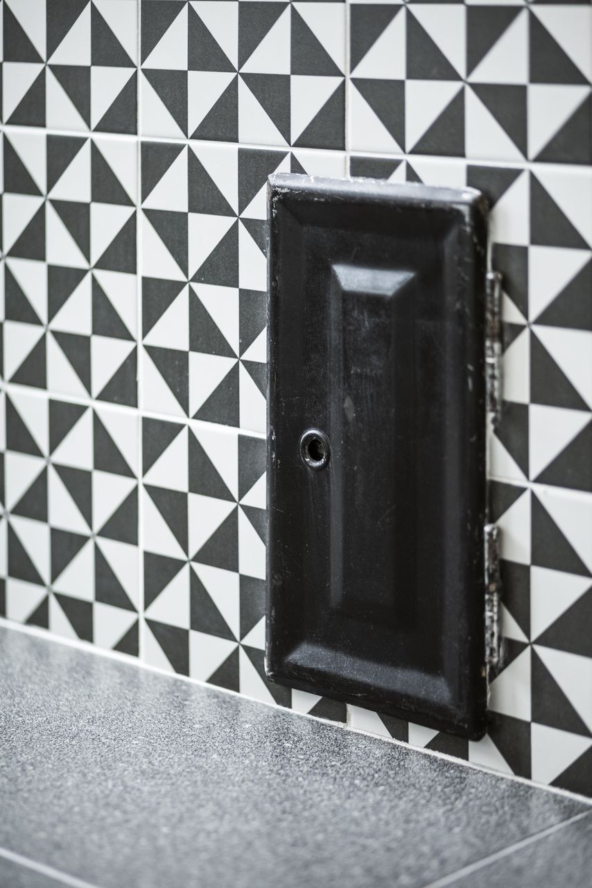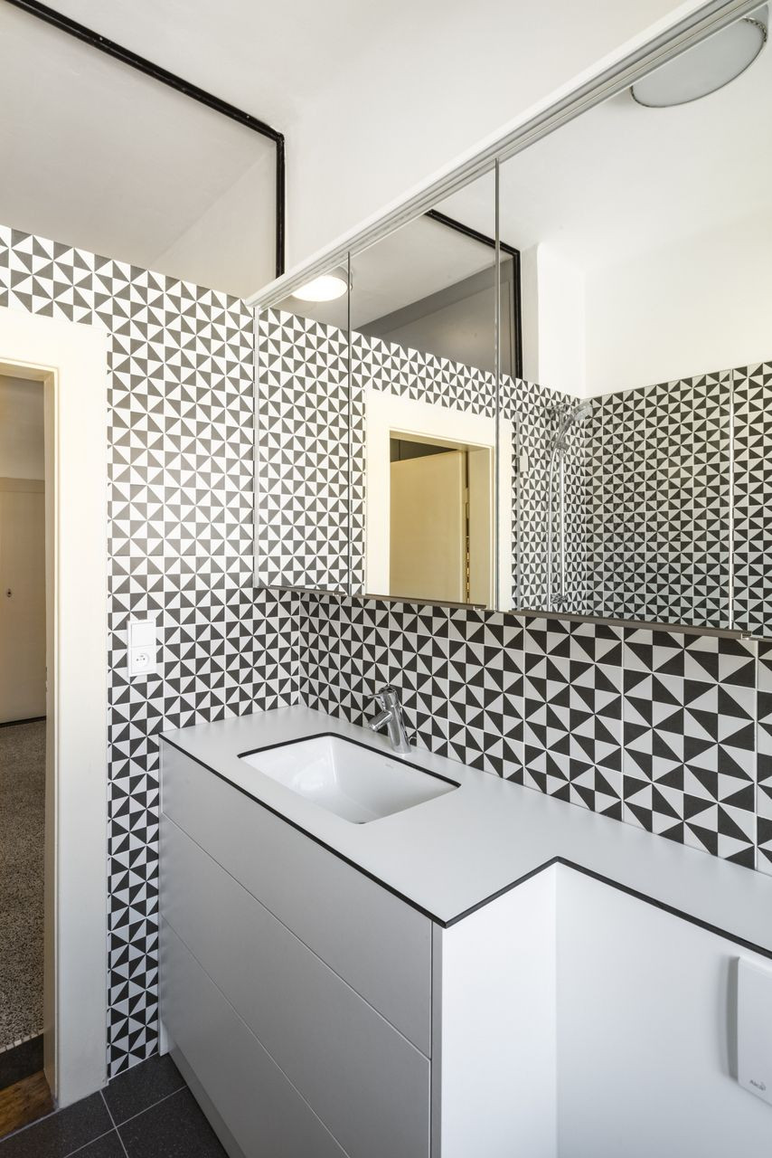 Byt dostal moderní tvář i díky vhodně zvolenému obkladu, který architekti použili jak okolo kuchyňské linky, tak ve světlé koupelně. Tam se ještě odráží v zrcadlové skříňce umístěné nad umyvadlem a vytváří tak zajímavý efekt.