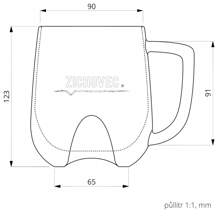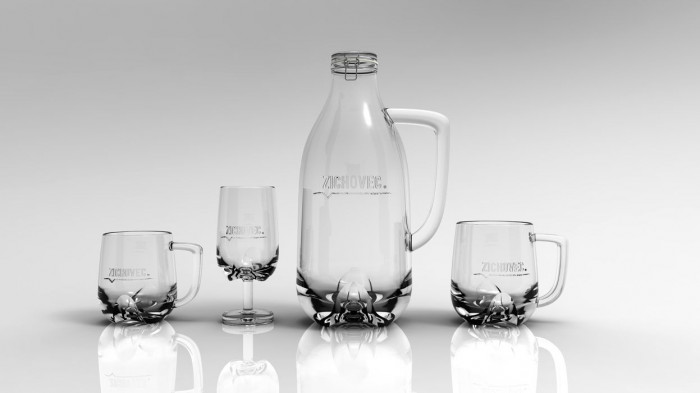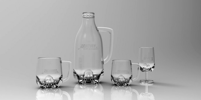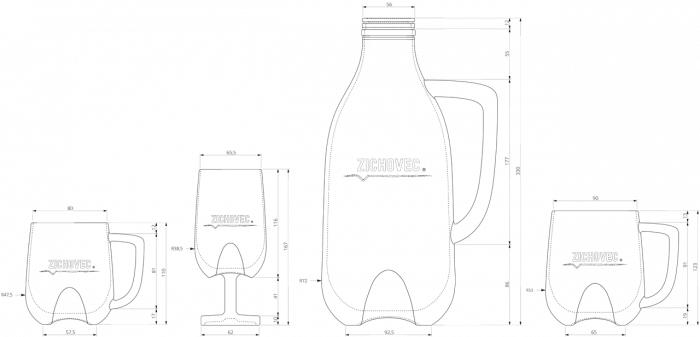 Nejdříve jsem začala navrhovat jen půllitr, ze kterého pak zcela přirozeně vyplynula celá ostatní řada. Chtěla jsem zachovat tradiční a mnou ověřený tvar sklenic, ale přitom tento tvar obohatit něčím výjimečným, něčím, čeho si budou moci konzumenti při prvním pohledu všimnout a co zaujme, ale přitom není prvoplánové. Tímto prvkem se stal výřez v dolní polovině sklenice a to ne náhodou. Pivovar Zichovec se nachází v oblasti údolí Zlatého potoka, které je velice ceněnou chmelařskou oblastí. Z tohoto místa je krásný výhled na horu Říp, která má symbolizovat právě onen výřez. Tento prvek se pak opakuje u celého setu a díky tloušťce dna sklenic a džbánu má jedinečnou možnost vyniknout.