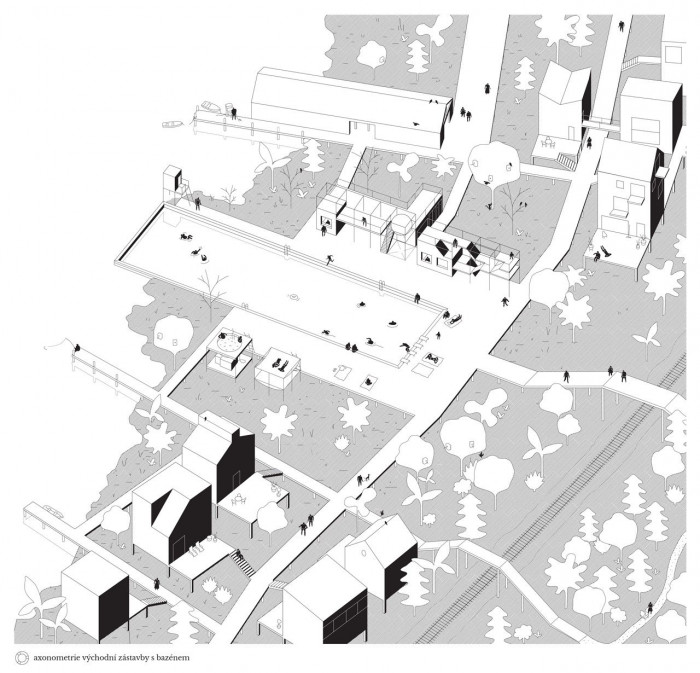 Voda v rybníce je voda podzemní. Žádný stálý přítok nemá a tak začátkem srpna začíná zelenat a sinice koupání znemožňují. Koukat na tu krásu a nemoct si zaplavat je utrpení. Na východní břeh umisťujeme filtrační bazén – sezónní těžiště na dlouhé letní večery. Bazén bere vodu z rybníka ale skrz jeho stěnu jí čistí na bází trojí fíltrace. Jeho zázemí má kiosek, plavčíka, šatny a velkou kovovou kouli jako nádrž na vodu pro sprchy. V zimě je zde půjčovna bruslí.