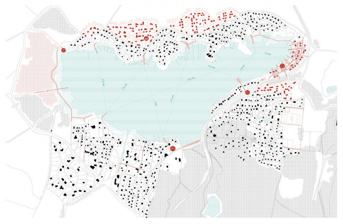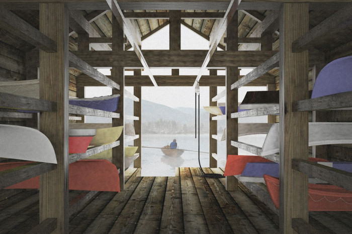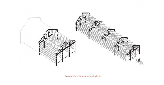 Podél břehu umísťujem sedm loděnic. Z dvou modulů – podélného a příčného uložení lodí – jsou poskládany do různých velikostí v závislosti na potřebě. V zásadě počítáme, že vedle auta bude mít každá domácnost i loďku. Loděnice jsou vybaveny kolejnicí s kladkou pro vytažení do vyšších polic a nejvyší patra slouží pro zazimování loděk těch, kteří bydlí u vody. Protože v zimě se obují brusle a celá dynamika místa se mění.