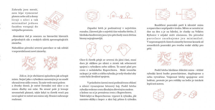 Rozdělení pozemků patří k identitě místa a reparcelace nepřipadá v úvahu. Město se nemění ze dne na den a je na bíledni, že chatky na Velkém Rybníce v nějaké míře zůstanou. Do původní parcelaca zasahujeme jen minimálně. V neprostupných částech zástavby bereme kousek od sousedících pozemků pro tvorbu tenké uličky pro pěší.