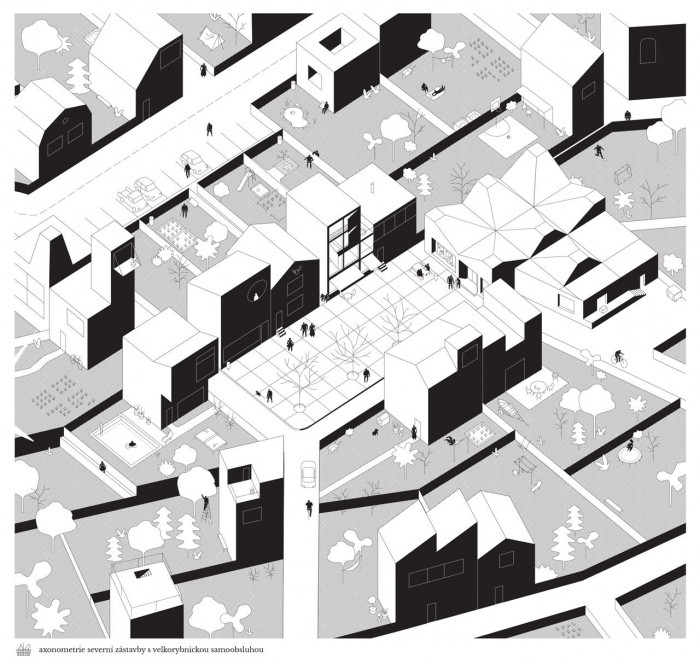 Pokud železnice a kaolínový důl na východě znamenají hranici, na severu rybníka taková bariéra neexistuje. Hranici sídla odvozujeme přímo od vzdálenosti k rybníku, tak aby to nikdo neměl dál než tři minuty chůze. Ve Velkém rybníce nenacházíme místo pro sprawl. Jestliže se sídlo rozroste vágní zástavbou satelitního charakteru, ztratí návaznost na Rybník. Navrhovaná zástavba je tedy kompaktní. Kvantitu vesele vyměnujeme za kvalitu. Zahrady jsou menší, zato lépe vymezené plotem nebo zdí a domy lícují s ulicí a tak minimálně jednou fasádou vstupují do veřejného prostoru. Abstraktní řád je omezen na hierarchii hlavních průjezdných ulic a tenkých uliček zprostupňujících zástavbu. Nahodilost původní severní parcelace se tak odráží v nepravidelnosti nové zástavby.
