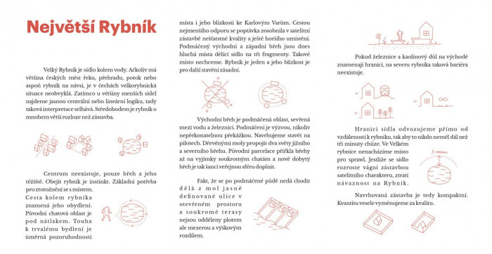 Zatímco u většiny menších sídel najdeme jasnou centrální nebo lineární logiku, tady taková interpretace selhává. Středobodem je rybník o mnohem větší rozloze než zástavba. Centrum neexistuje, pouze břeh a jeho těžiště. Obejít rybník je instinkt. Základní potřeba pro ztotožnění se s místem. Cesta kolem rybníka znamená jeho obydlení. Původní chatová oblast je pod nátlakem. Touha k trvalému bydlení je úměrná pozoruhodnosti místa i jeho blízkosti ke Karlovým Varům. Cestou nejmenšího odporu se poptávka zosobnila v satelitní zástavbě nešťatstné kvality a ještě horšího umístění. Podmáčený východní a západní břeh jsou dnes hluchá místa dělící sídlo na tři fragmenty. Takové místo nechceme. Rybník je jeden a jeho blízkost je pro další stavění zásadní.