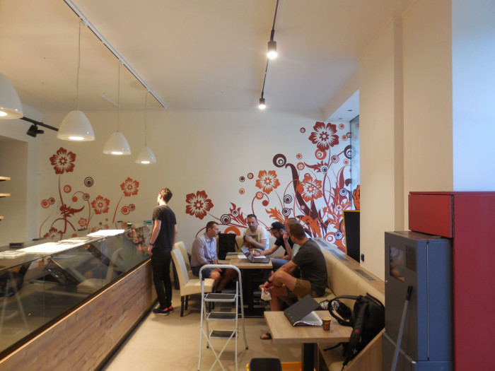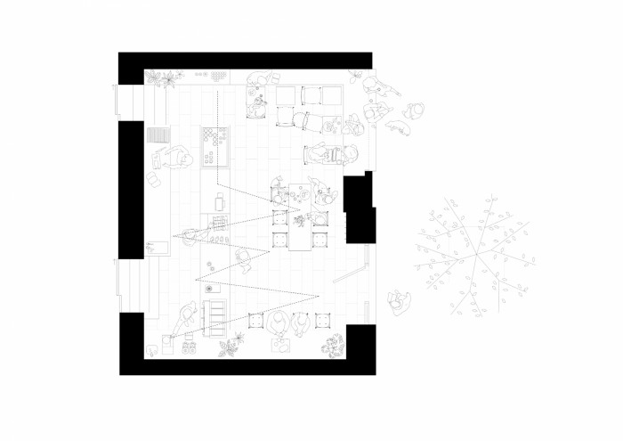 Dispozice definována dvěma kompaktními bloky nabízí tři různé charaktery posezení, dostatek místa při nákupu u pultu a zejména dostatečnou variabilitu prostoru, která se osvědčila i při provozu omezeném pandemickými opatřeními. Oba bloky v sobě kombinují více funkcí a slouží pro obsluhující i obsluhované. Neformální propojení s exteriérem v teplejších měsících umožňuje výsuvný výkladec. Díky rekonstrukci prostoru došlo k odhalení původní kamenné podlahy, deinstalaci podezřelého bankomatu a odstranění gargantuovské reklamní plochy z kamenné fasády.