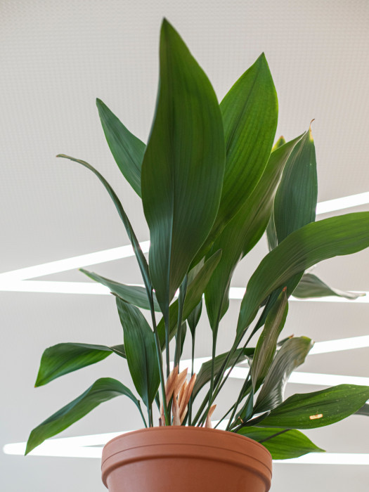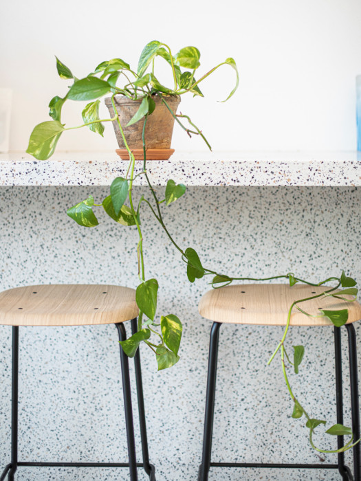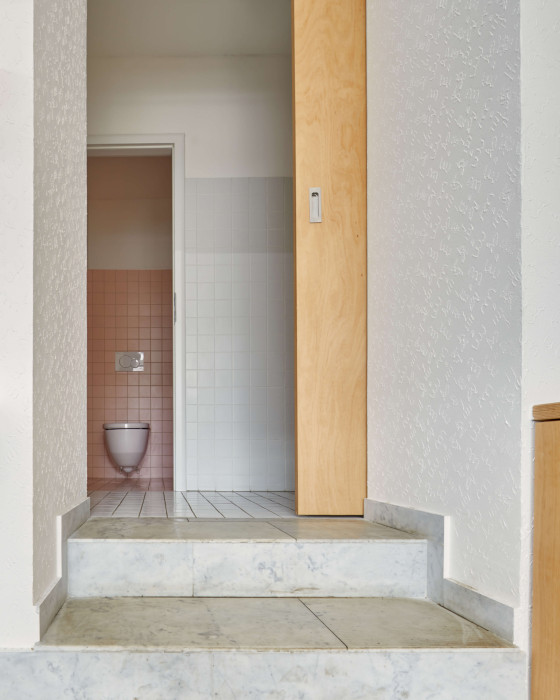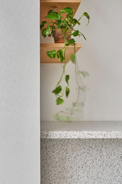 Materiálově i prostorově dominuje jednolitý hlavní pult z umělého kamene, který je po obvodu doplněn linií bukové překližky. Kámen pro práci, dřevo pro hosty. Velmi důležitá je také materialita ploch a práce s jejich texturami vytváří decentní podklad životu v kavárně. Bílo-bílá kombinace linkrusty a klasického štuku přechází v akustický podhled s vloženým bleskem. Nenápadné, ale o to významnější je použití právě linkrusty – tento plastický, omyvatelný nátěr známý z chodeb bývá standardně odstraňován, ale zde se naopak podařilo vytvořit a použít vlastní linkrustu na míru, jejíž motiv vychází z rozložené skici kohoutí hlavy od Davida Černého. Svým způsobem opovrhovaný materiál je velice funkční a zároveň jej využíváme jako avantgardní dekoraci.