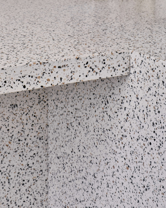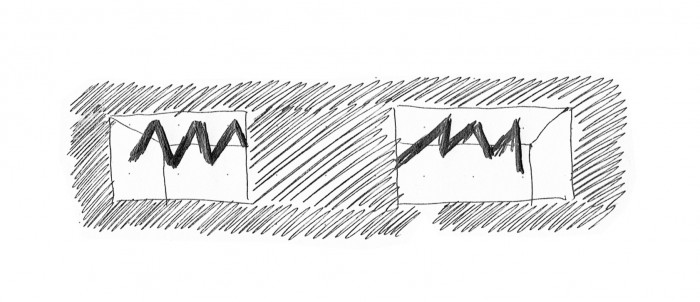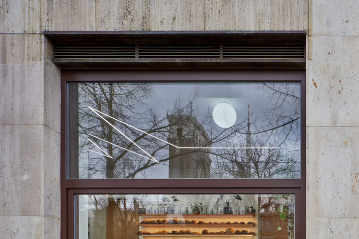 Vzhledem k charakteru místa i kavárny jako typu jsme zvolili solidní, konzervativnější přístup reprezentovaný multifunkčním monolitem z umělého kamene, samozřejmě ve zcela současném duchu. Zároveň bylo ve všech ohledech žádoucí pracovat s principiálním propojením obou podniků stejné značky. Zásadním tématem tedy bylo nalezení rovnováhy mezi jedinečností kavárny a její návazností na původní bistro v sousedním domě. Ikonický blesk tak nyní prochází skrz oba domy, ovšem mění svou formu na svítidlo zapuštěné do podhledu a jeho energie se v kavárně uklidňuje narovnáním a posléze symbolickým ukončením kulatým svítidlem – tečkou. Radikální materiálový řez bistra se zde deradikalizoval do jemné linie mezi štukem a linkrustou přecházející do obkladu v hygienické části. Dalším spojujícím prvkem je kromě použití překližky, stejného typu židlí a vysokého sezení u vchodu také spolupráce s grafikem Markem Fantou a výtvarníkem Davidem Černým aka Honey.