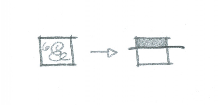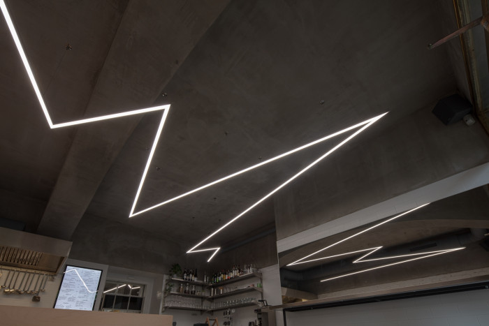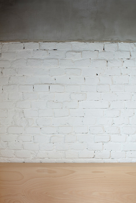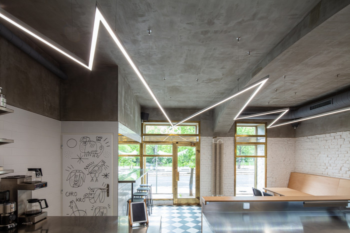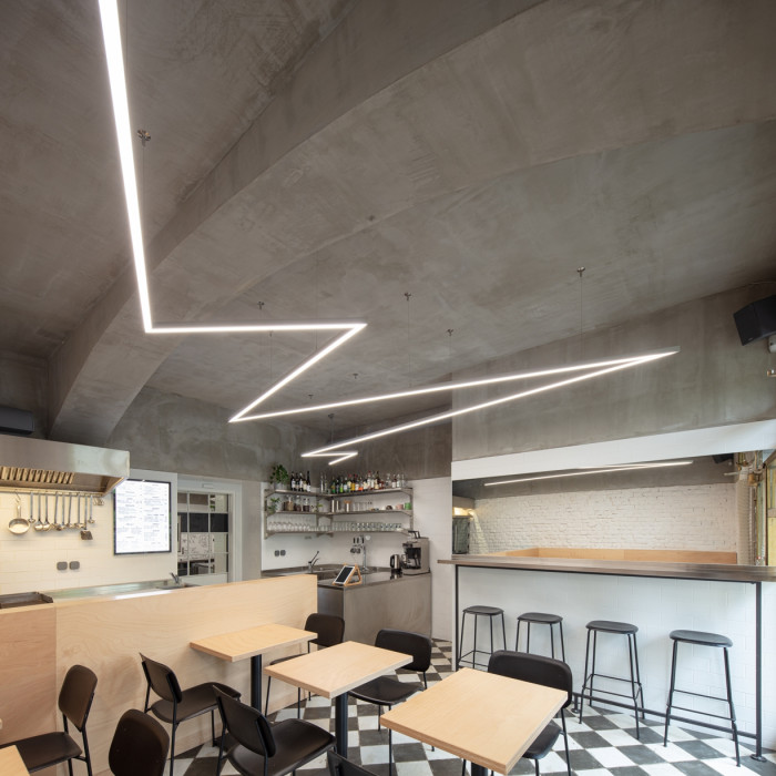 V průběhu projektu nakonec došlo k odstranění všech nejhorších pozůstatků původního interiéru, ale koncept řezu zůstal zachován. Navržená monochromatická vrstva uklidňuje a sceluje celý prostor, pod úrovní řezu se rozehrává kombinace módních, ale adekvátních materiálů. Na bíle natřené cihly - kromě podlahy jediný pozůstatek původního interiéru - svým rastrem navazuje keramický obklad. Jednoduchá překližková lavice plynule přechází v barový pult, za nímž se nachází otevřená kuchyně s barem. Vše se odehrává v jediné místnosti: prostor pro hosty definuje dřevo, obligátní nerez vymezuje obsluhující a výrobní část a vše propojuje námi navržené originální svítidlo.