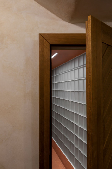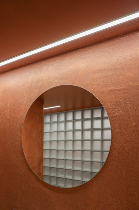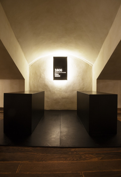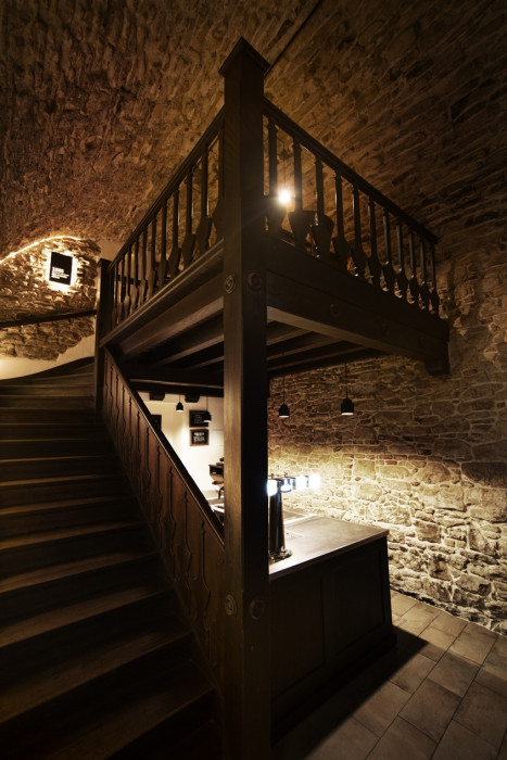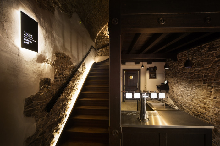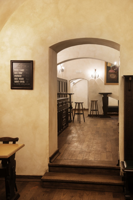 V obou případech byl stav restaurace sice funkční, ale daleko za prahem morální životnosti: dvě desítky let nekoordinovaných úprav se podepsaly nevhodnou barevností, osvětlením, detaily a objekty v podobě pseudohistorizujících či lehce nevkusných dekorací, svítidel, reklam apod. Celý prostor jsme od balastních prvků očistili a následně sjednotili výmalbou, mobiliářem, osvětlením, informačním systémem a kvalitními detaily. Vše smysluplné bylo zachováno. Jediné nové, zcela současné zásahy definuje černá ocel. Konkrétně se jedná o pulty na stání s jemným detailem a systém informačních svítidel, který návštěvníka provází nejdůležitějšími letopočty od vstupu až do sklepení, kde je završen levitující tabulí shrnující historii objektu. Pod ní nahradil původní dřevěnou tankovnu elegantní černý box. Zásadní výzvou bylo řešení toalet. Kvůli omezením historické stavby fungovaly na minimálním prostoru a nezřídka se zde tvořily fronty, ovšem díky elegantnímu prohození dispozice se nám podařilo přidat toaletu navíc pro dámy a razantně zlepšit obslužnost u pánů. Atmosféru kompaktního, červeného prostoru doplňují nerezové zařizovací předměty, zapuštěná liniová svítidla a kulatá zrcadla. Dominantou je dělící stěna z průsvitných, neprůhledných luxfer.